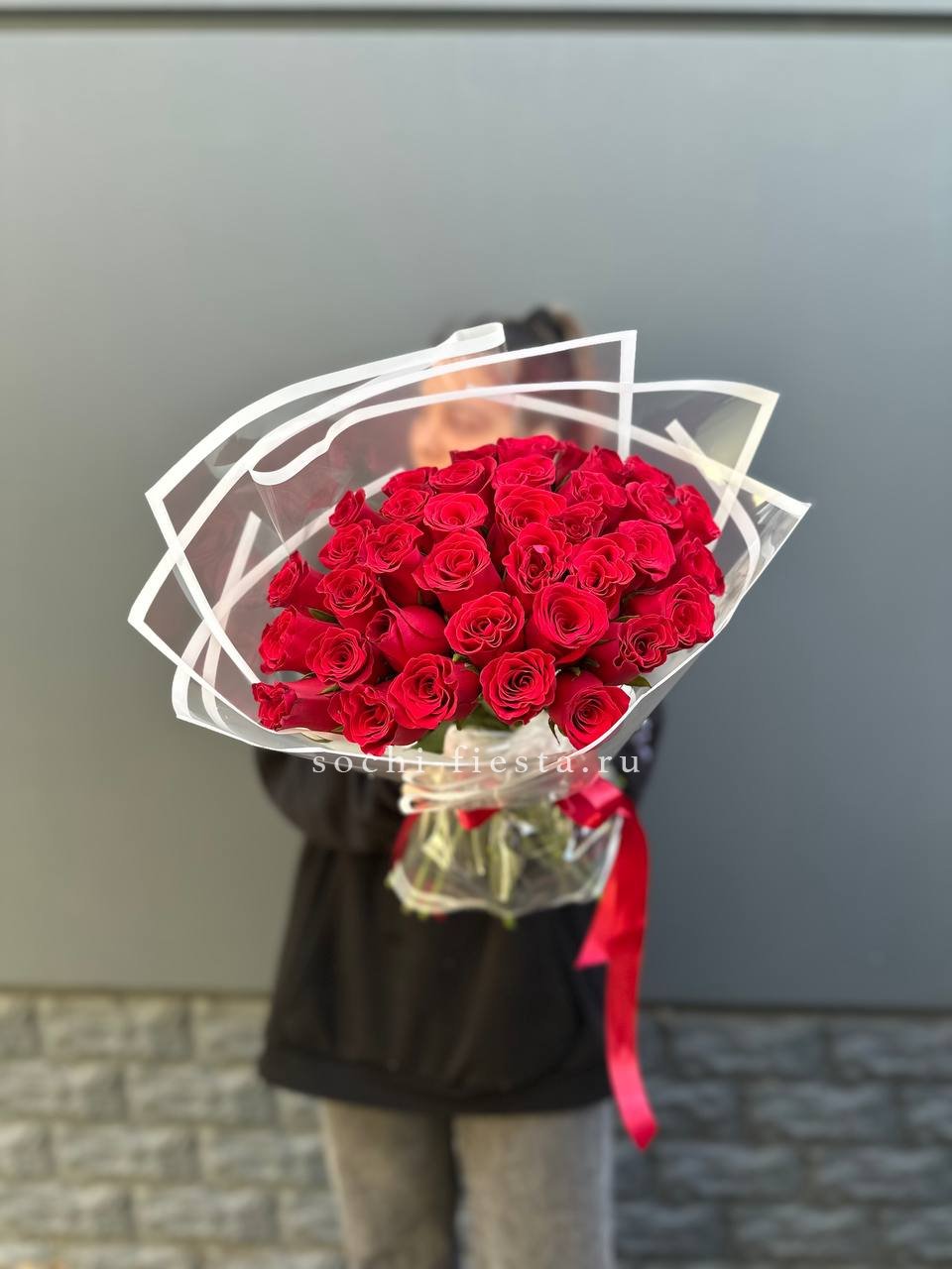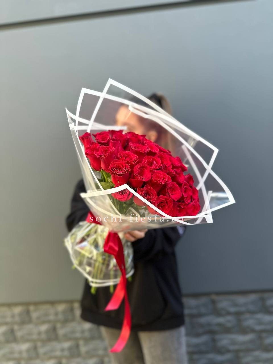 Тридцать один бутон насыщенного красного оттенка собраны в плотную композицию. Упаковка мягко обрамляет цветы, сохраняя естественную форму и позволяя каждому бутону раскрыться в своем ритме.