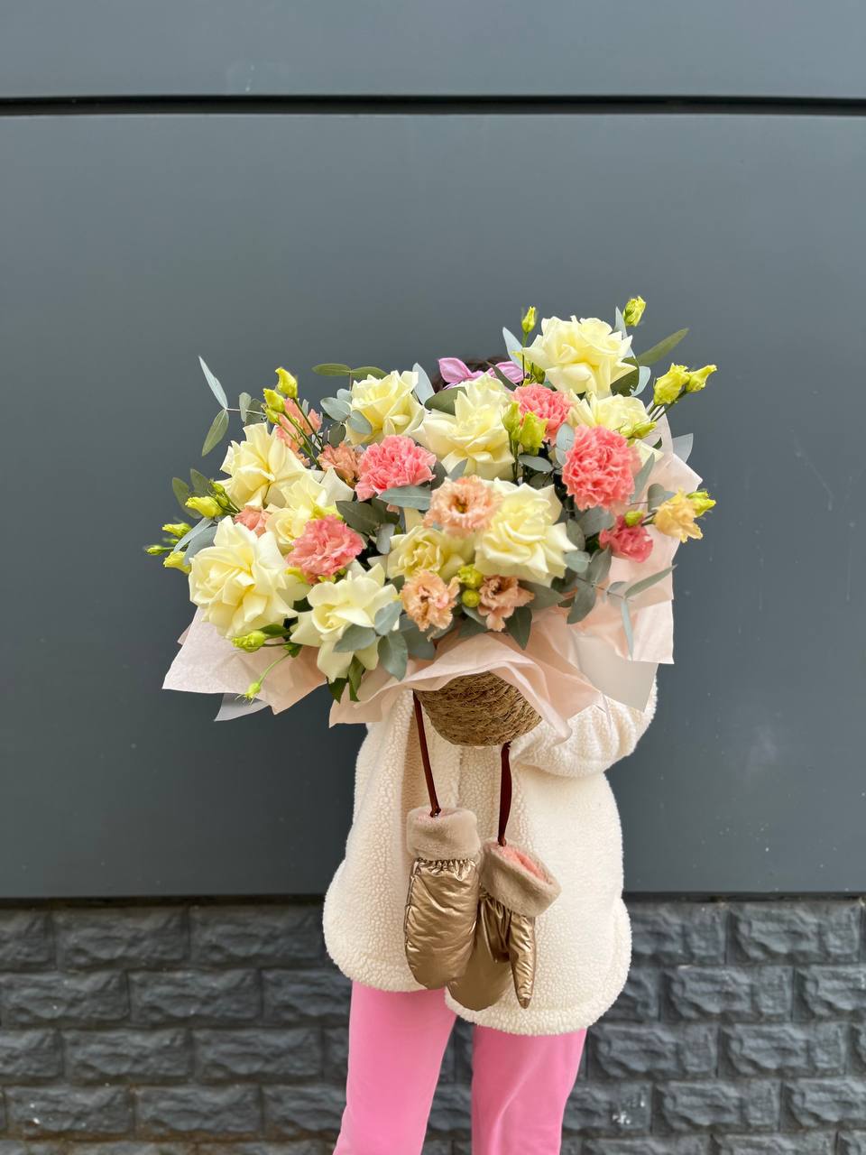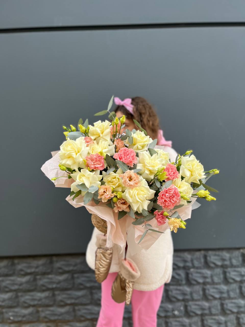 бомбастик, роза, эустома, диантус, эвкалипт, авторская упаковка, лента.