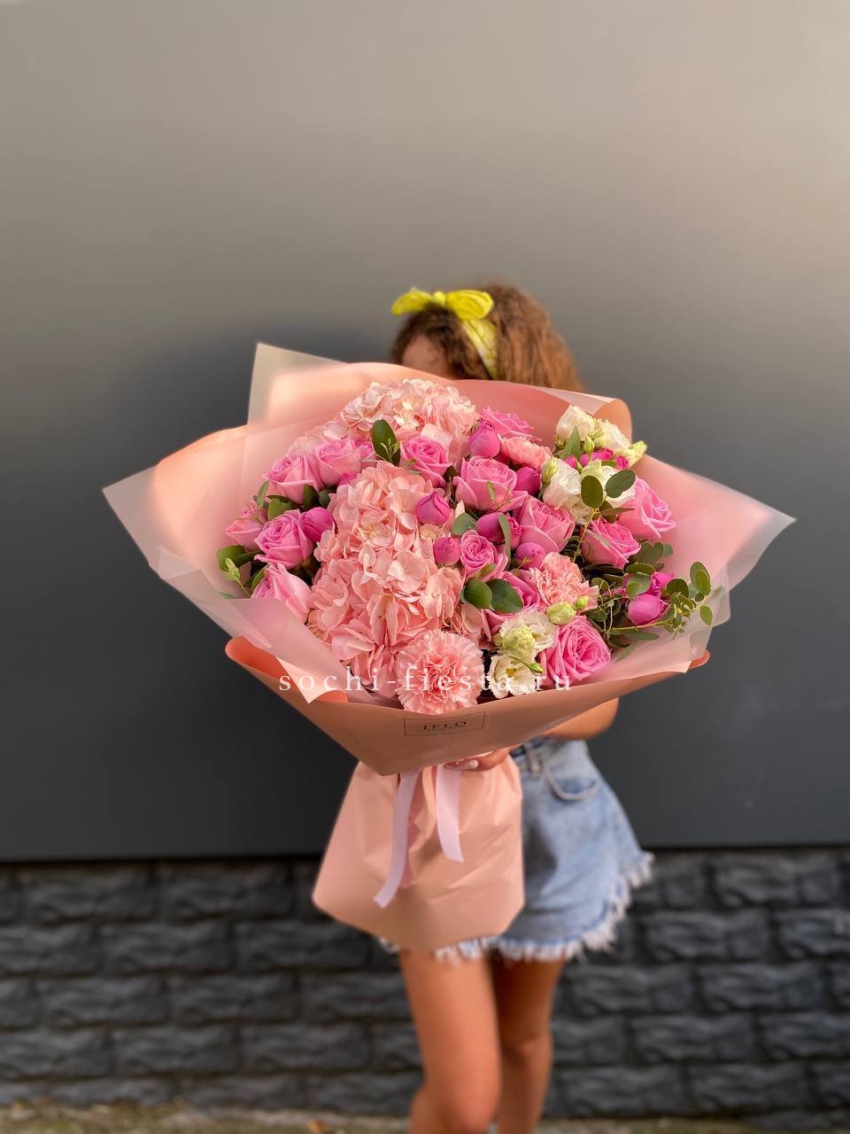 гортензия, мисти бабблс, роза, эустома, диантус, эвкалипт, авторская упаковка, лента