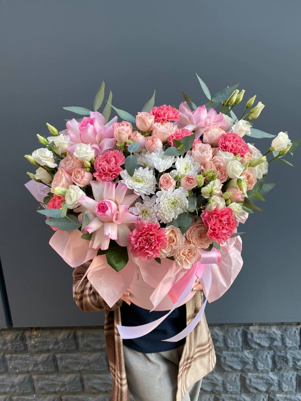Пышная композиция в круглом боксе объединяет розы, эустому, хризантемы и диантус в плотную цветущую массу. Бомбастик добавляет объёма, а эвкалипт смягчает переходы между соцветиями. Готовое решение для размещения на столе или комоде.