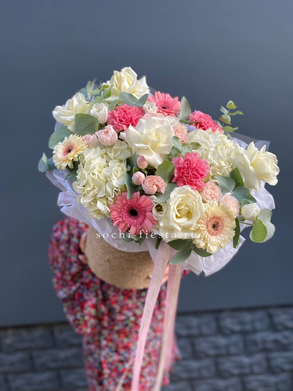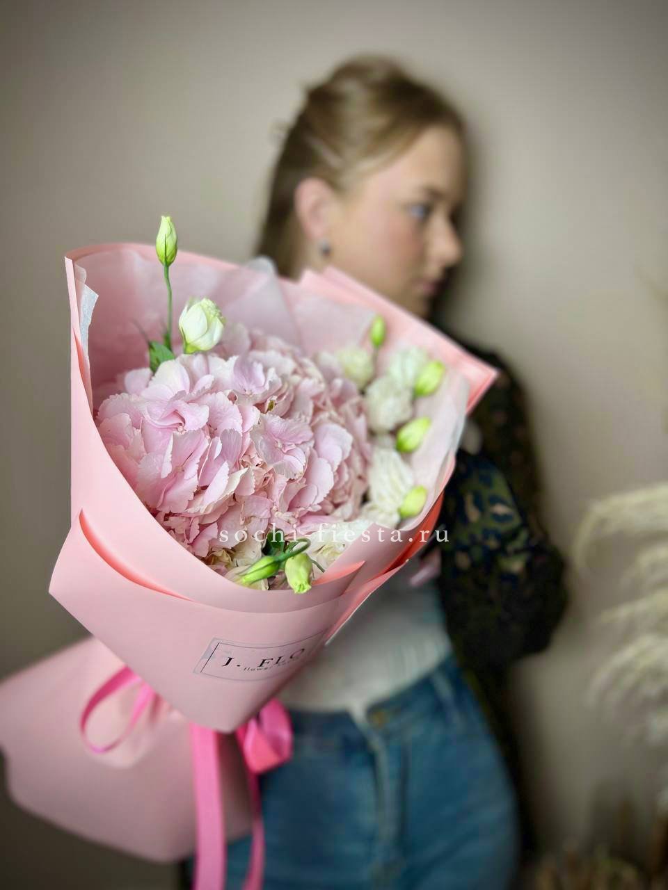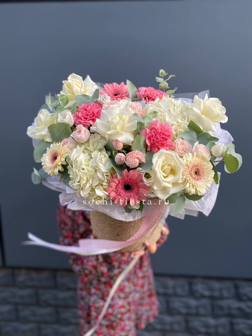 гортензия, хлопок, бомбастик, белая роза, маттиола- может меняться от сезона на диантус, ковыль, упаковка.