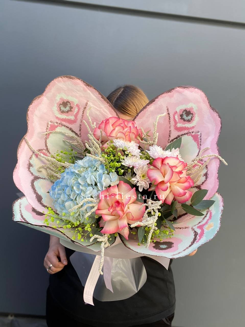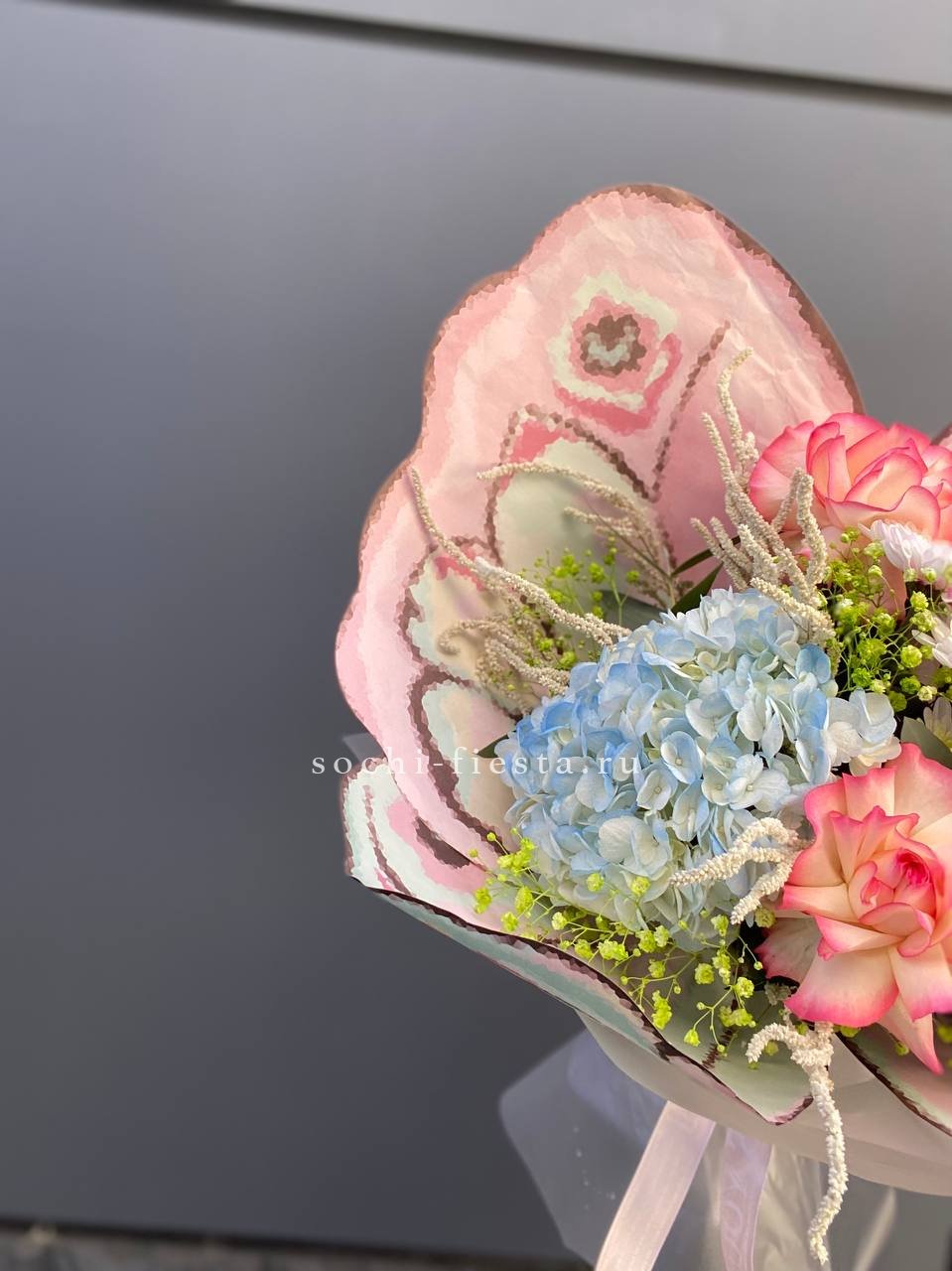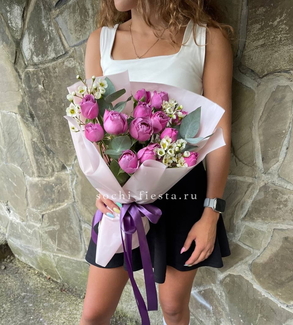 Пионовидные розы раскрываются густыми лепестками, хамелациум добавляет воздушности. Композиция держит форму и долго сохраняет свежесть.