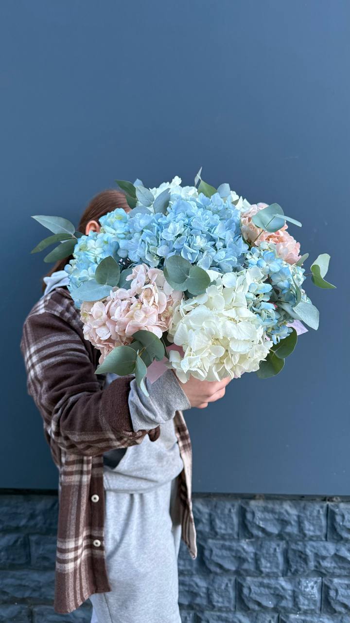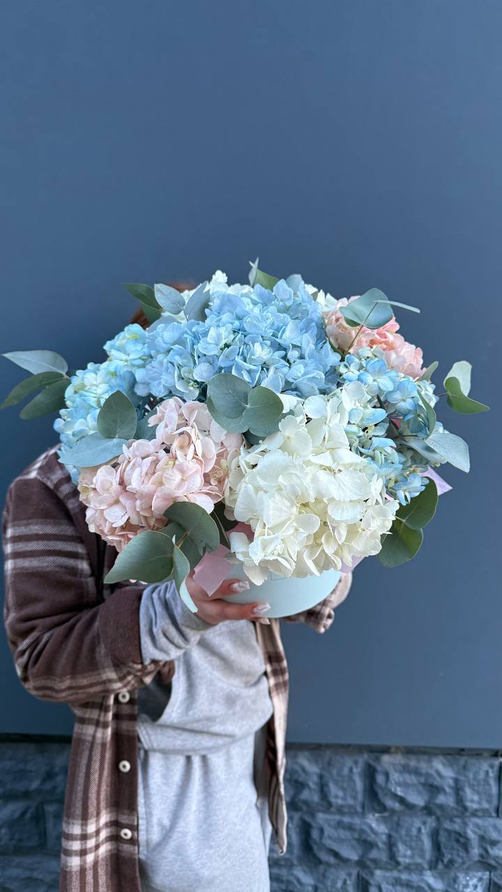 Пышная шапка гортензии в мягкой тонированной упаковке напоминает облако в обрамлении ткани. Соцветие раскрывается множеством мелких лепестков, создавая объёмную текстуру и живую игру оттенков.