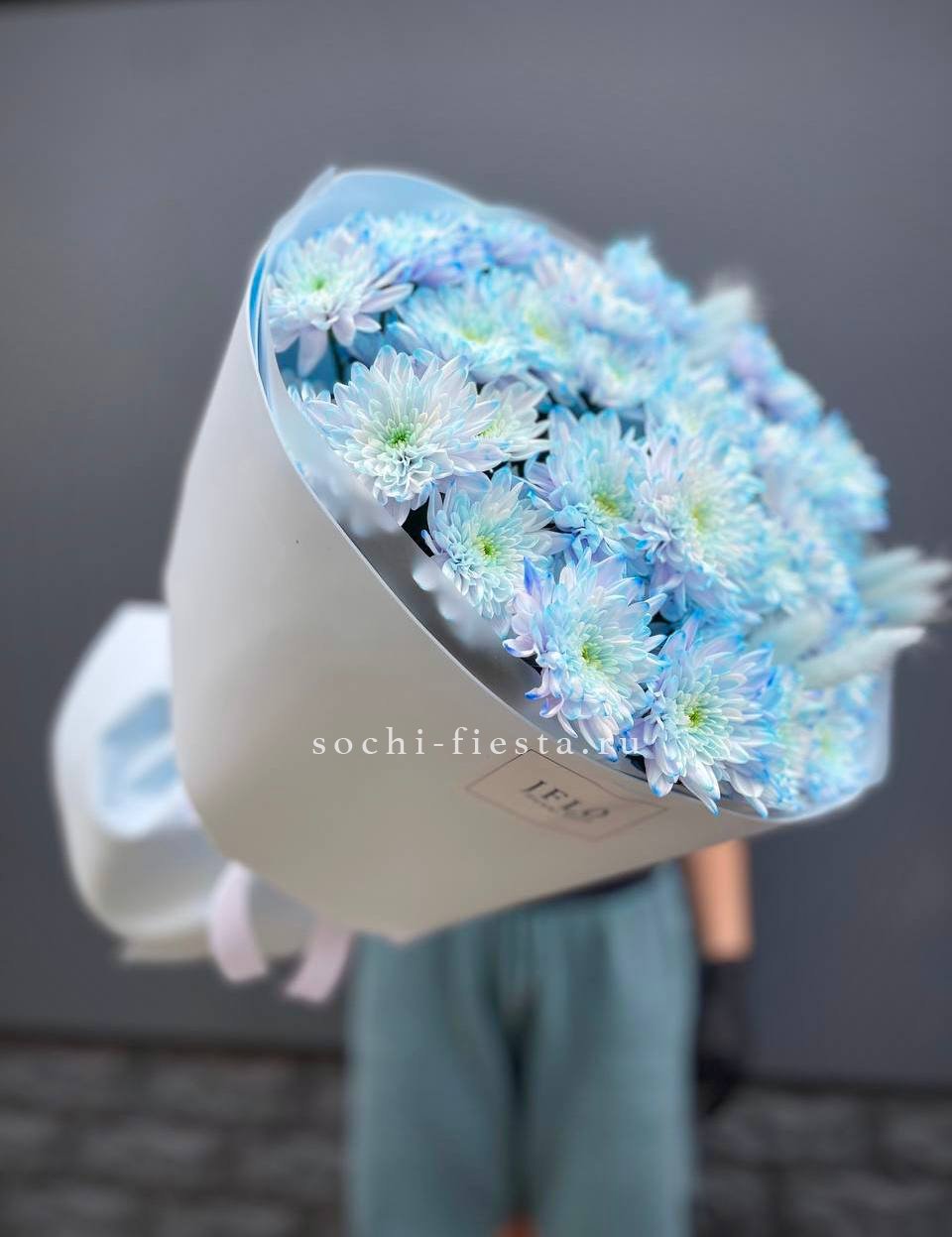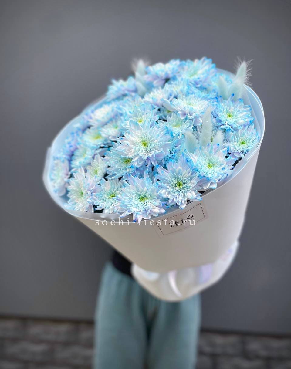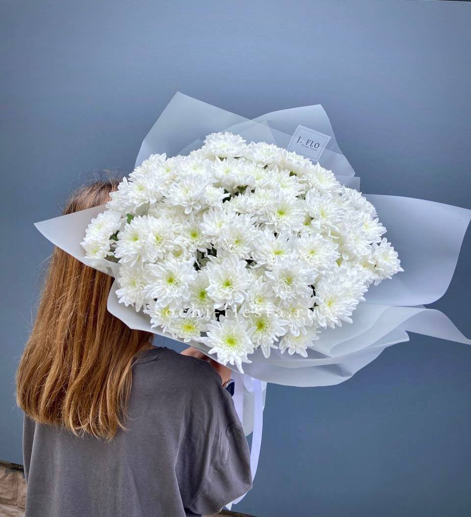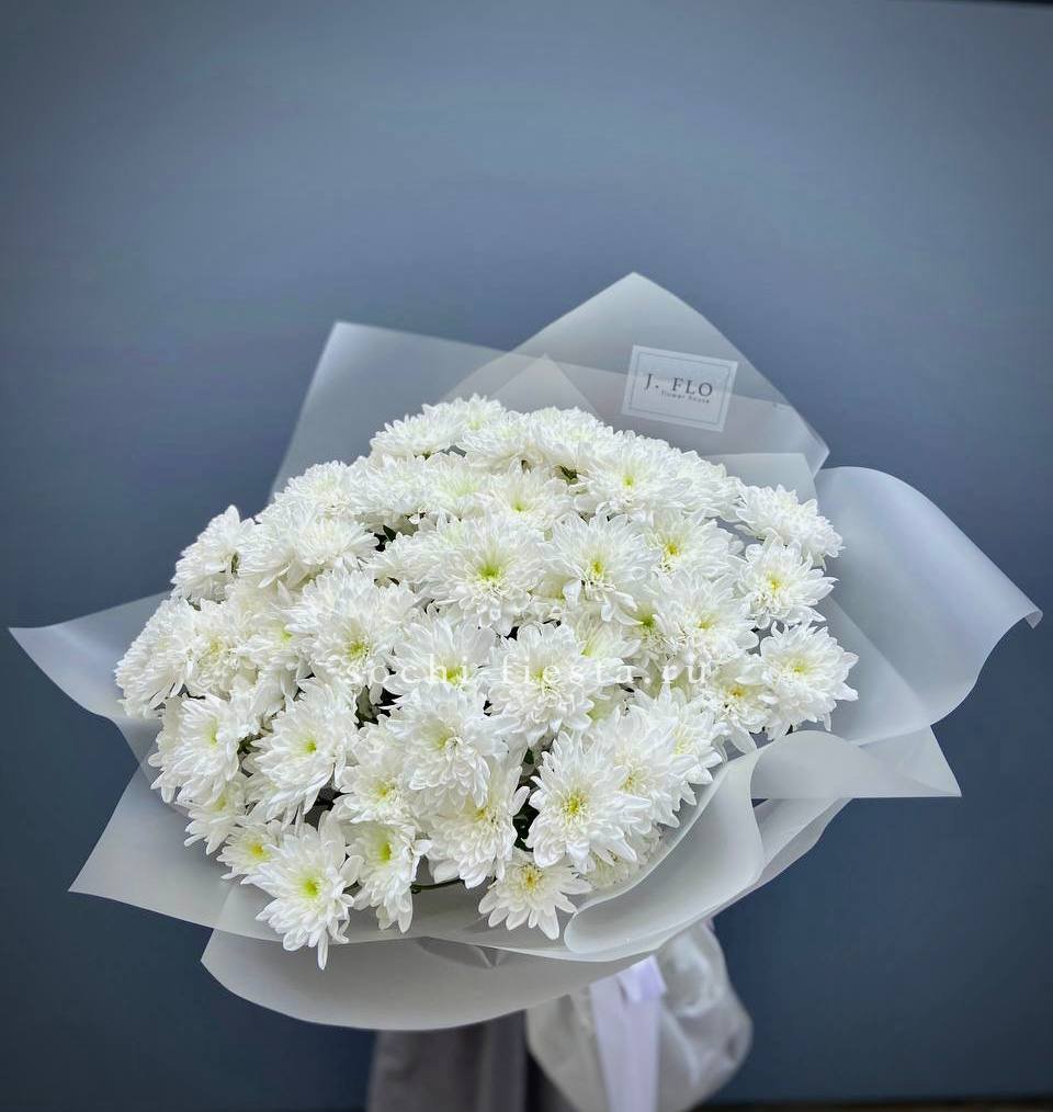 хризантема одноголовая - 9 шт., хамелациум, 5-7 шт., лента, дизайнерская упаковка.