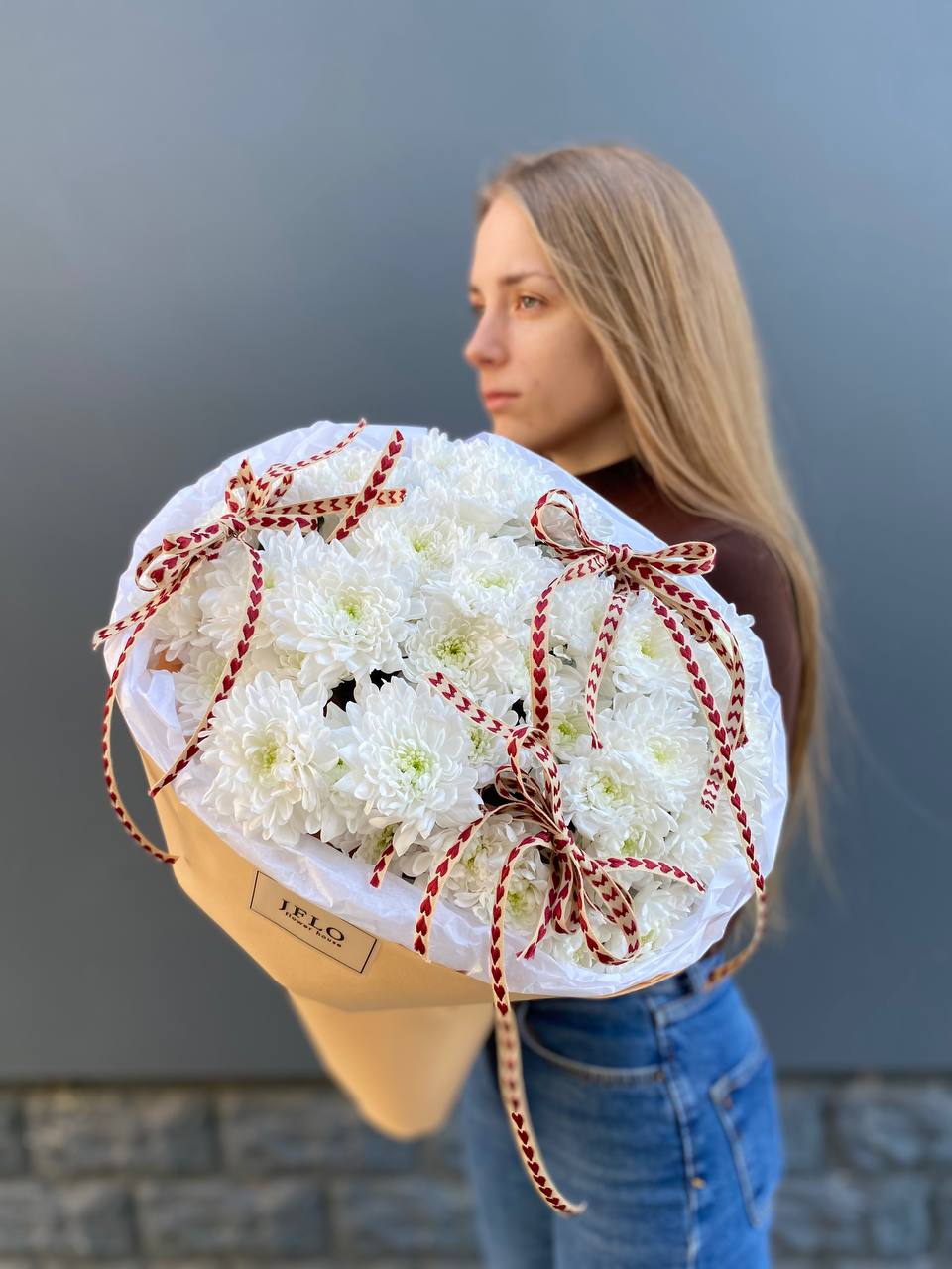 Семь хризантем собраны в плотную округлую форму и украшены бежевой упаковкой с тремя тонкими бантами. Сердечки на лентах добавляют композиции трогательности. Букет держит форму и выглядит аккуратно в руках или в вазе.