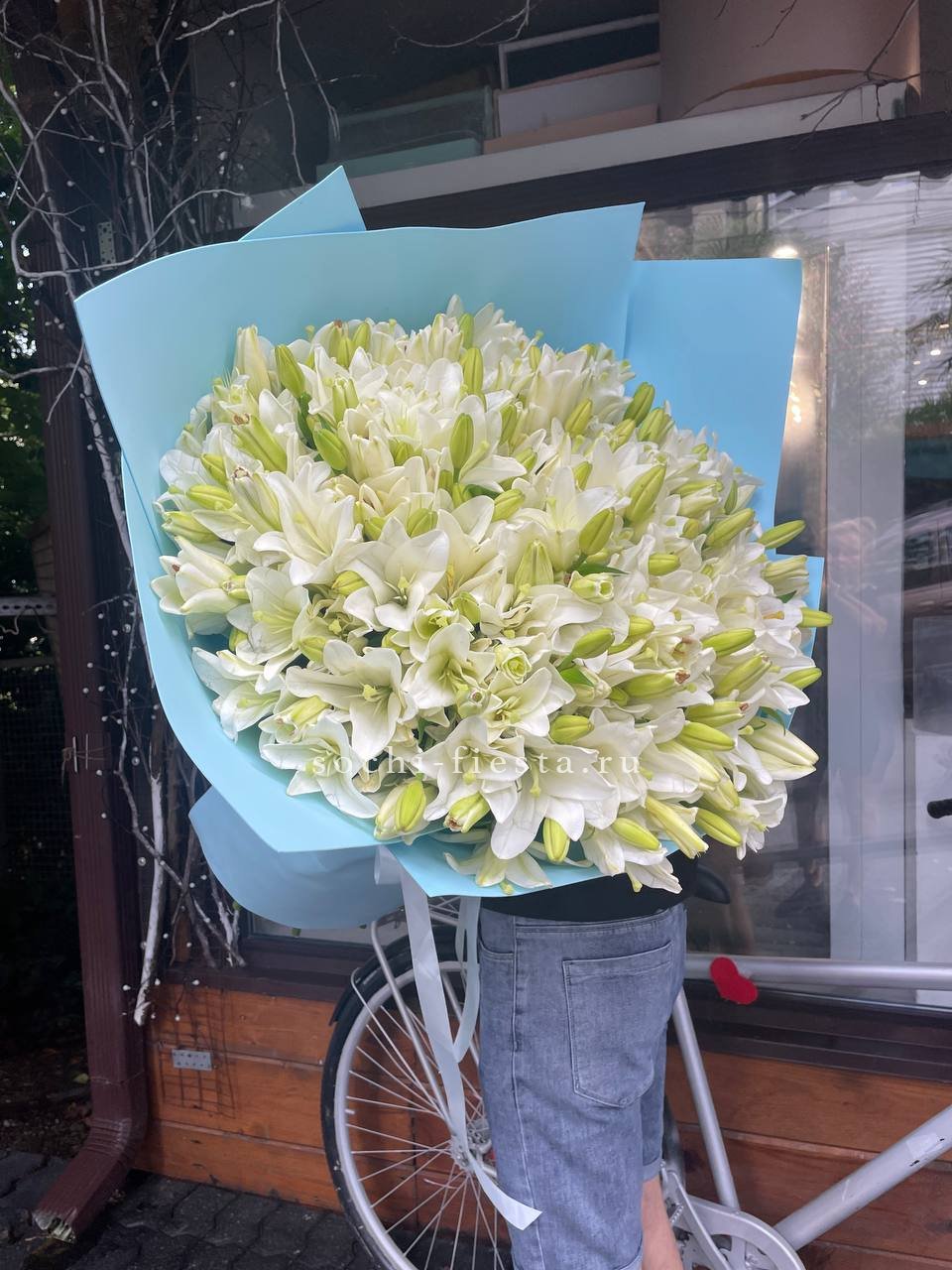 Пятьдесят один стебель лилий в плотной сборке. Бутоны раскрываются постепенно, продлевая жизнь композиции на долгие дни. Высокий букет с выразительным присутствием в любом пространстве.