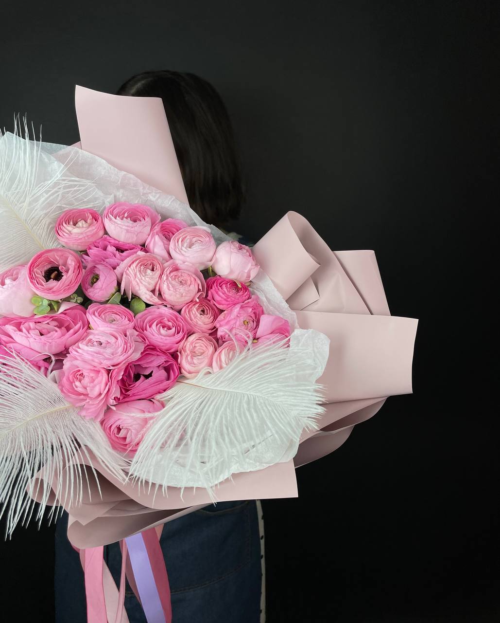 Двадцать пять розовых ранункулюсов раскрываются пышными головками, создавая воздушное облако из многослойных лепестков. Страусиные перья добавляют композиции графичности и легкости.
