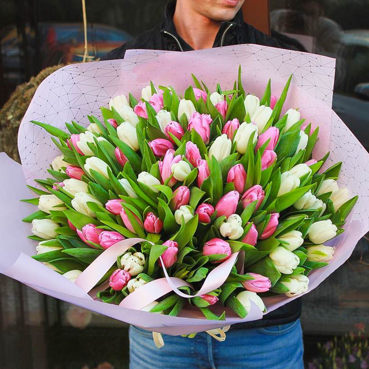 Сто один тюльпан в разных оттенках создают объемную цветовую волну. Плотная сборка и дизайнерская упаковка превращают букет в яркое визуальное событие. Это про масштаб и весеннюю энергию.