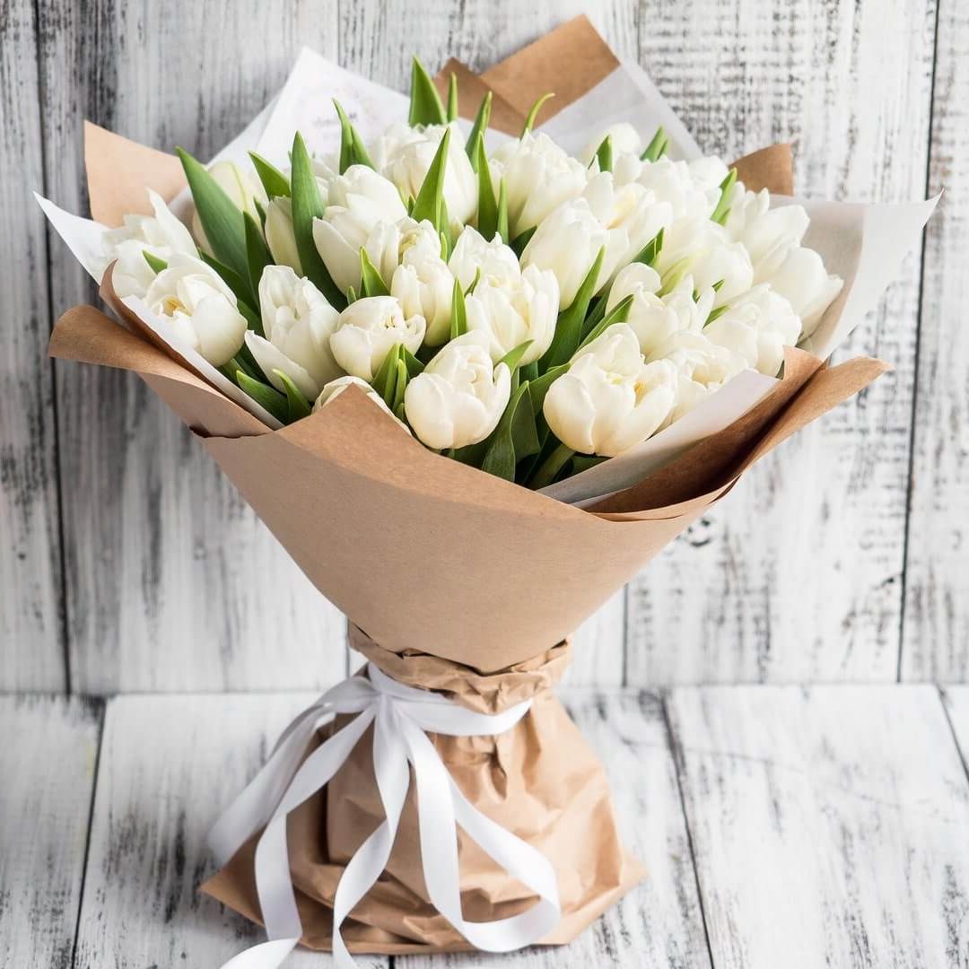 Двадцать пять пионовидных тюльпанов в лаконичной двухцветной обёртке. Белые бутоны с густыми лепестками держат форму и радуют свежестью несколько дней подряд.