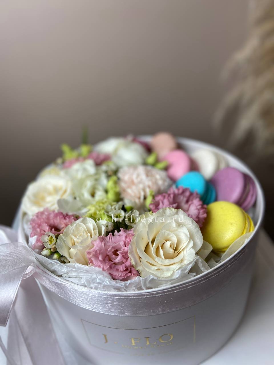Для заказа товара "Цветы в цилиндре с макаронс "Прованс"" с доставкой в Калуге нажмите в корзину