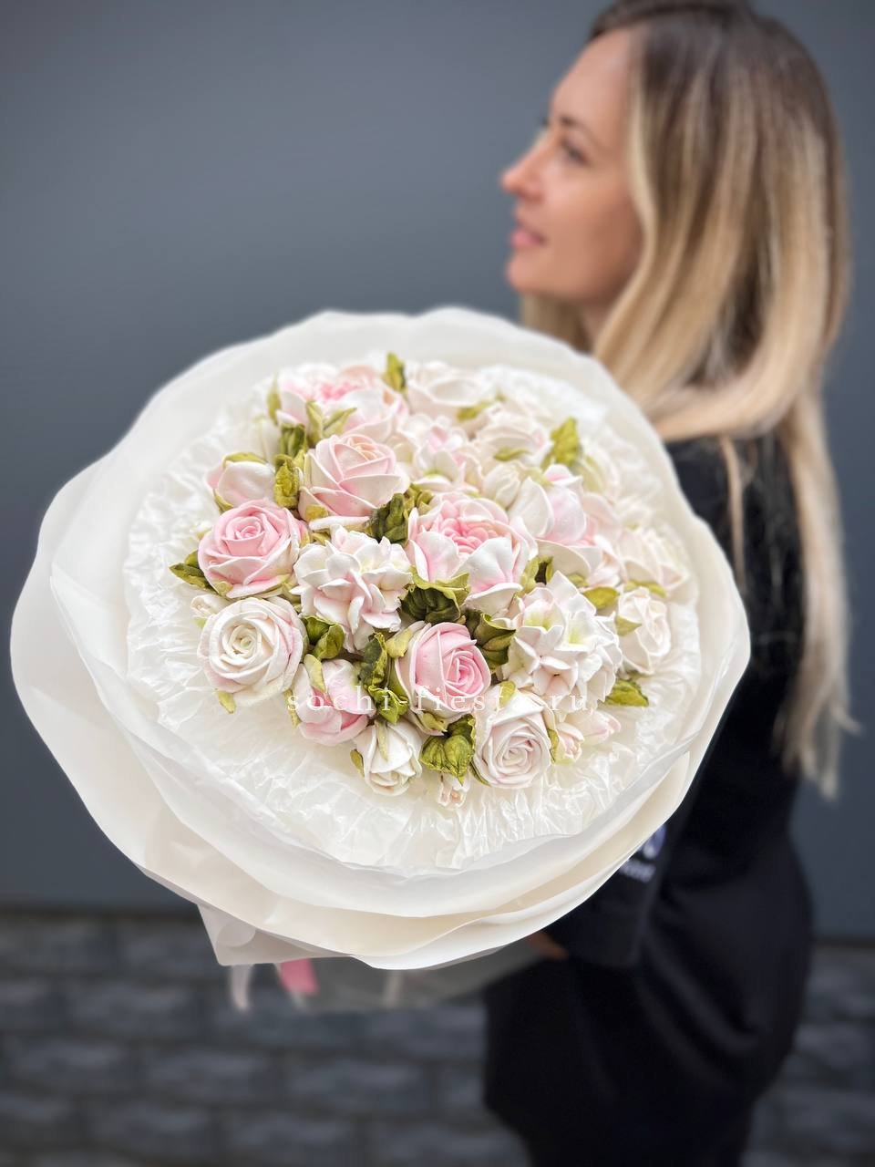 Воздушные лепестки из зефира собраны в объемную композицию. Натуральные оттенки и мягкая текстура делают этот букет необычным дополнением к celebration.