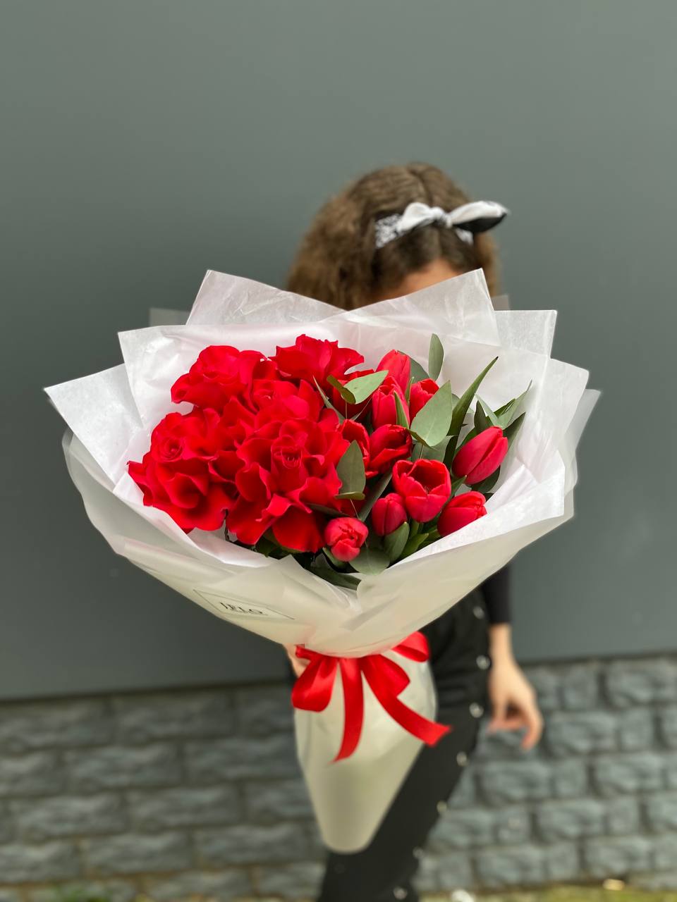 Красные тюльпаны переплетаются с розами в динамичной композиции, где весенняя лёгкость встречается с классической формой. Два цветка в одном букете создают визуальную глубину и живой ритм.