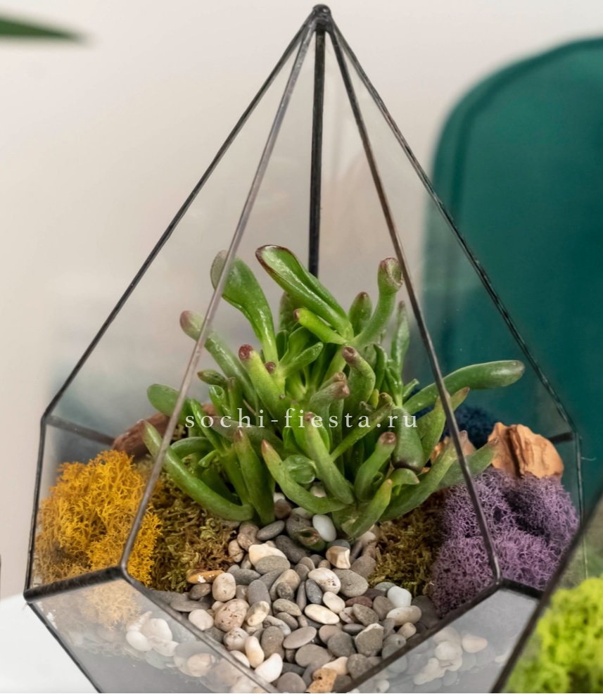 Крассула Хоббит под стеклом в форме капли выглядит как миниатюрный сад. Суккулент растет медленно и почти не требует полива.