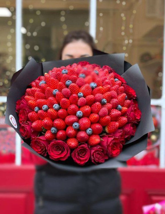 Двадцать пять роз и полтора килограмма отборной клубники с голубикой формируют объемную композицию. Щедрый масштаб и плотное наполнение делают её заметной в любом пространстве.