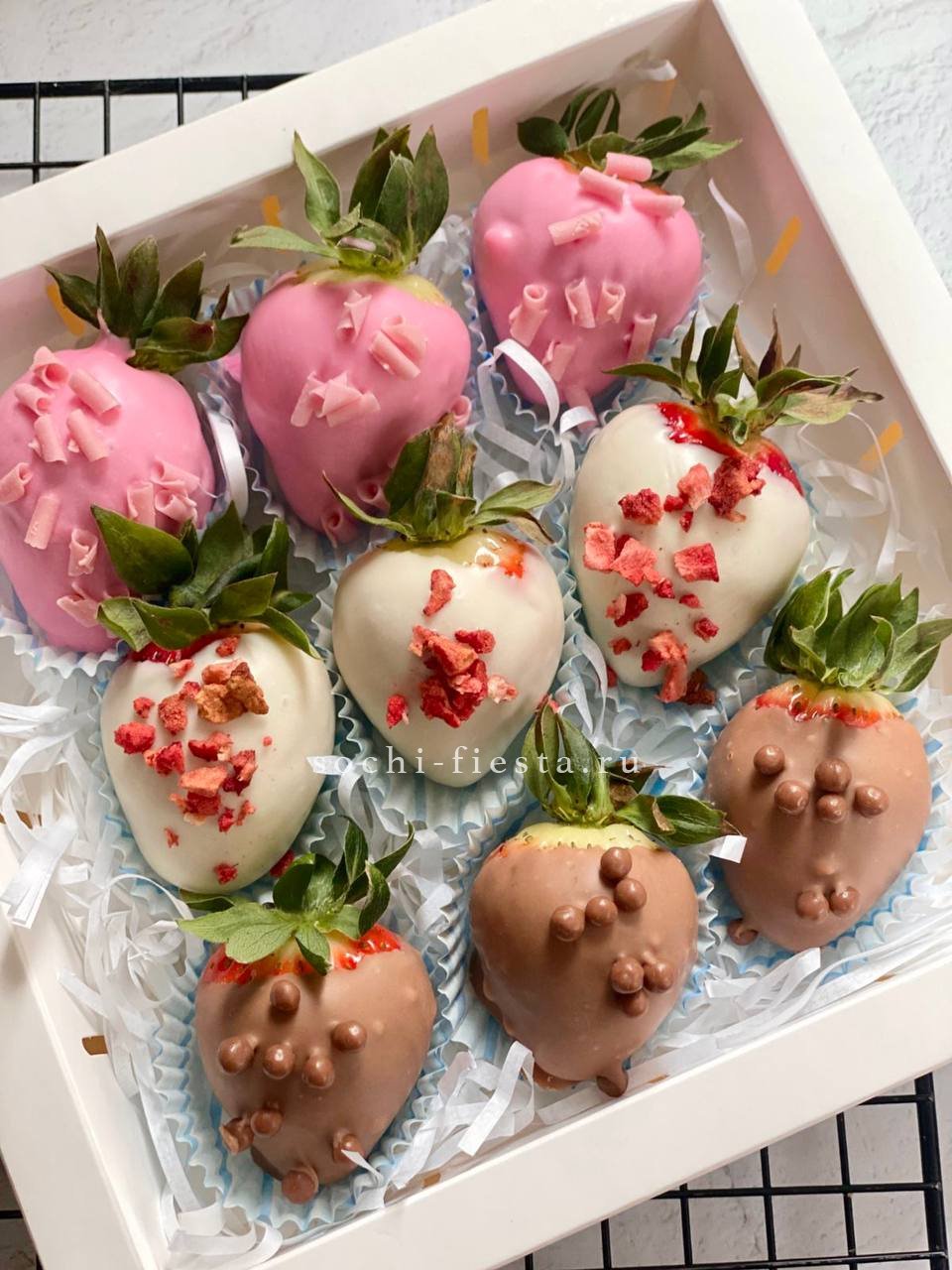 1100-1200 г. ароматной клубники, 100г. голубики, баночка мёда, лента, крафт.