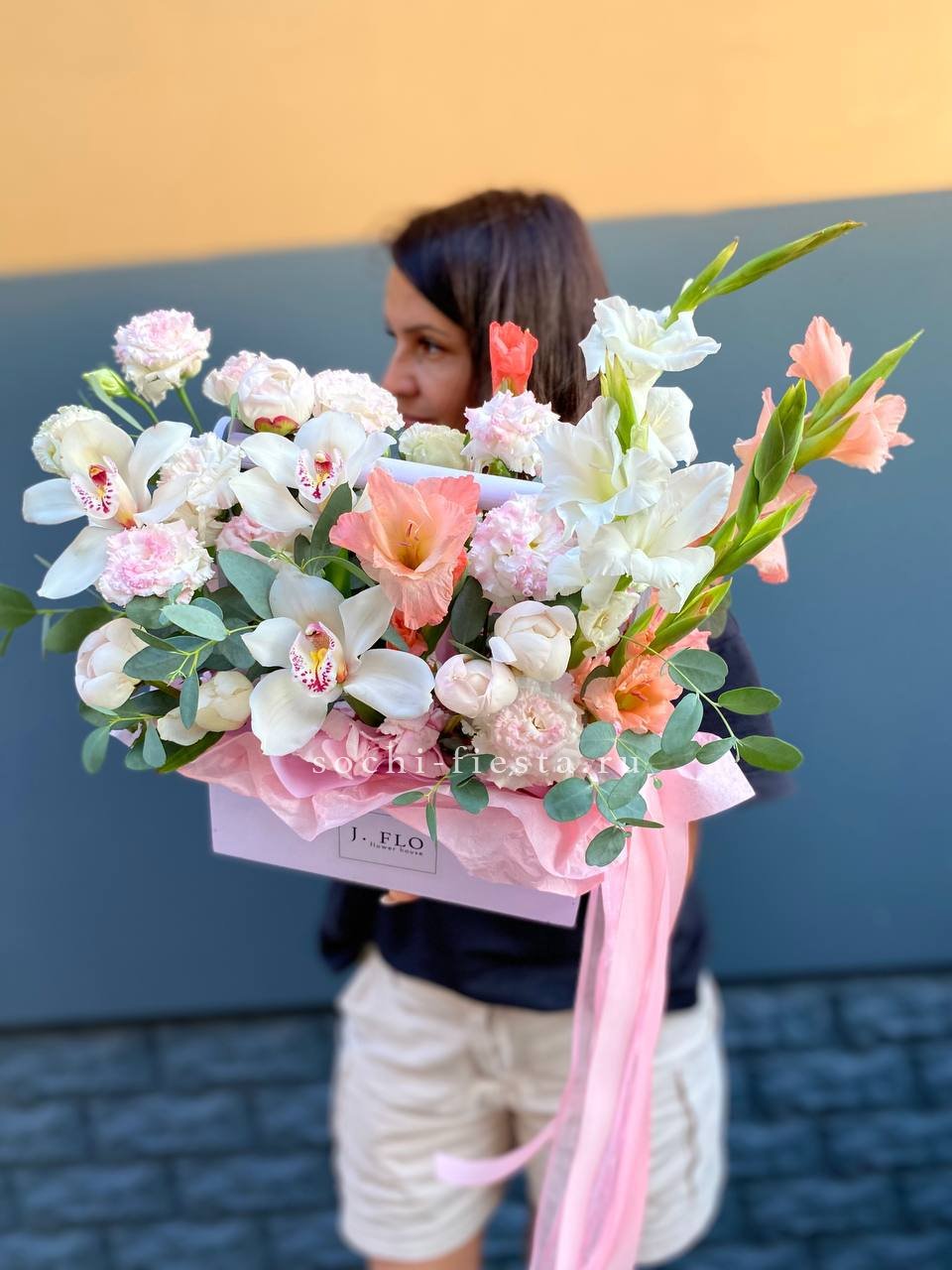 цветочная композиция в нежно-кремовых тонах с применением орхидеи, эустомы, пионов и других цветов, деревянный ящик, лента.