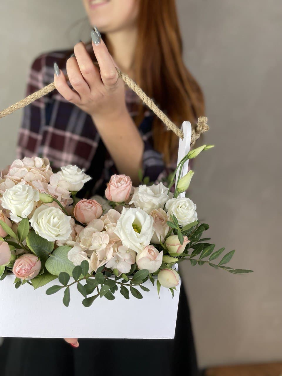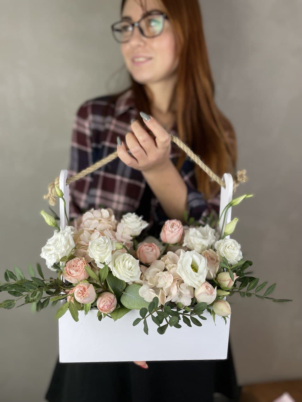 гортензия, пионы Сара Бернар, роза белая, гипсофила (замена вне сезона), дельфиниум (замена вне сезона), эвкалипт, деревянный ящик, лента.