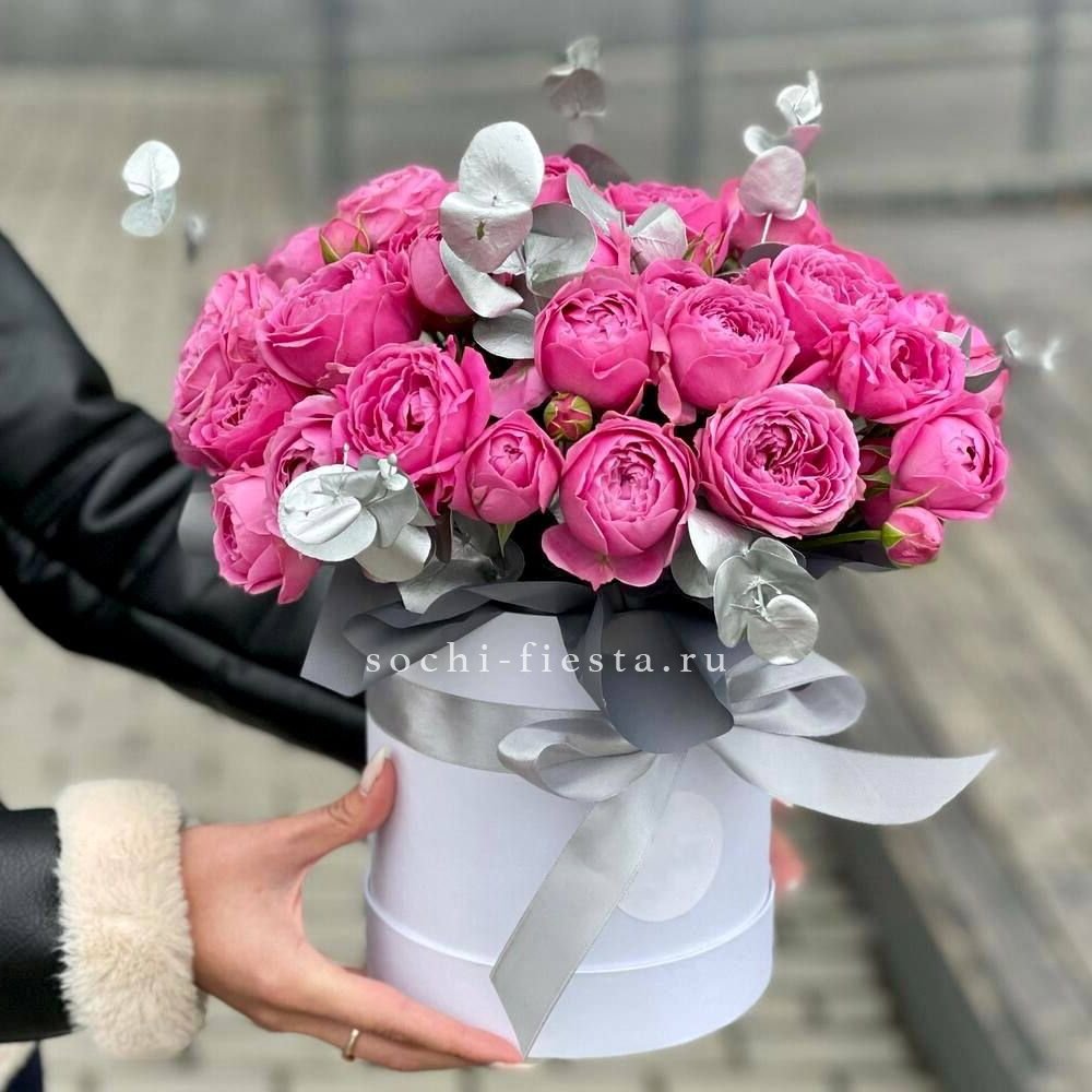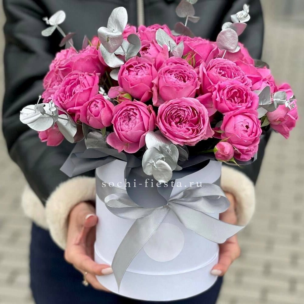 Композиция в коробке объединяет пышную гортензию, воздушную эустому и кустовые розы, Джумилию с яркими гербами и хлопком. Плотное заполнение создает округлую форму, где каждый цветок находит свое место без пустот.