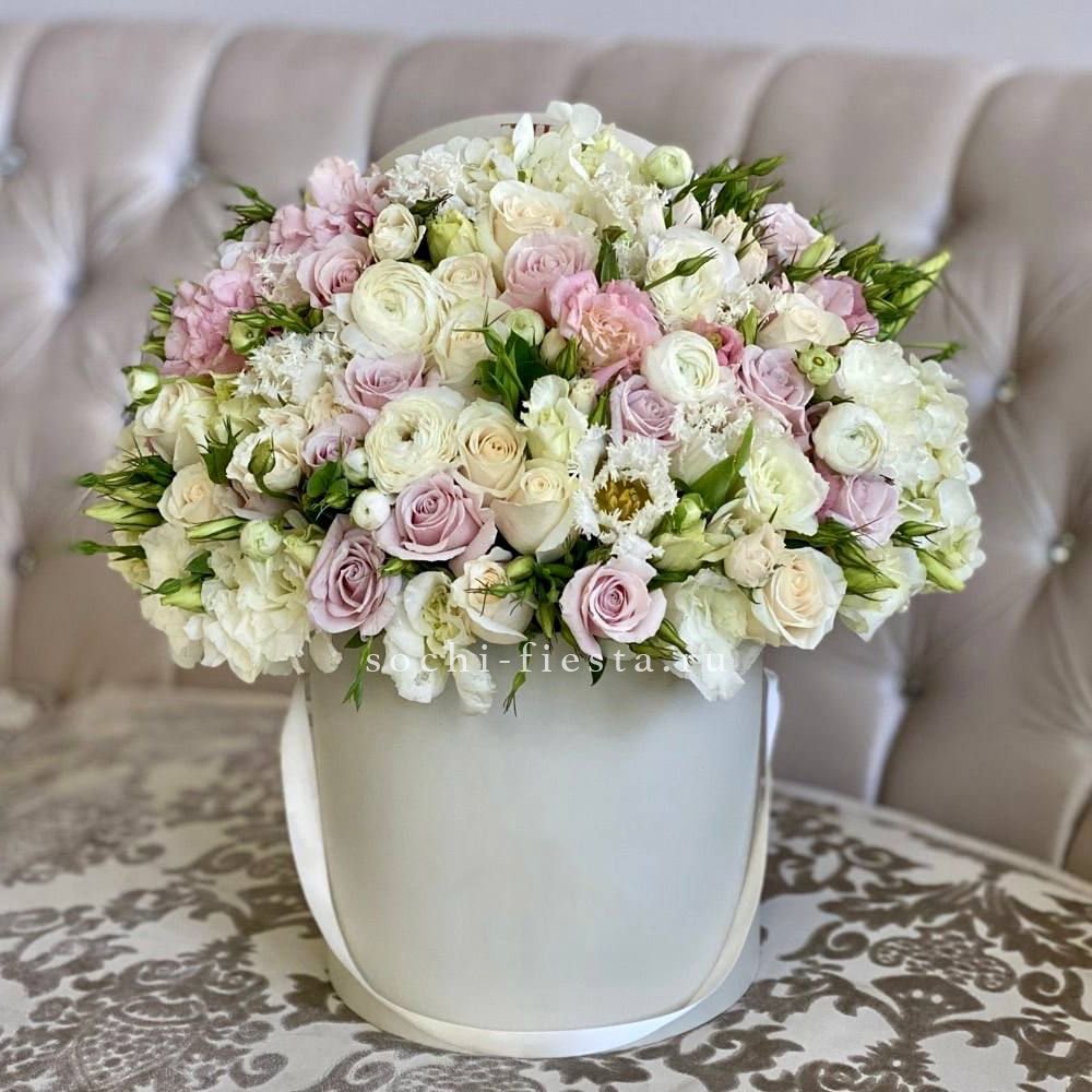 роза, диантус, пионы или гортензия, розы, бомбастик, эустома, декоративная зелень, цилиндр D16.