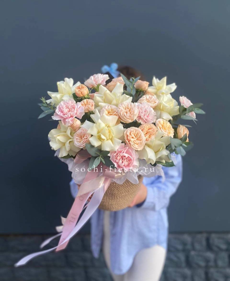 Мягкая палитра белых оттенков с вкраплениями диантуса создает воздушную композицию в натуральном джутовом кашпо. Кустовые розы добавляют объем, а эвкалипт завершает природную гармонию. Готовое решение для интерьера в спокойных тонах.