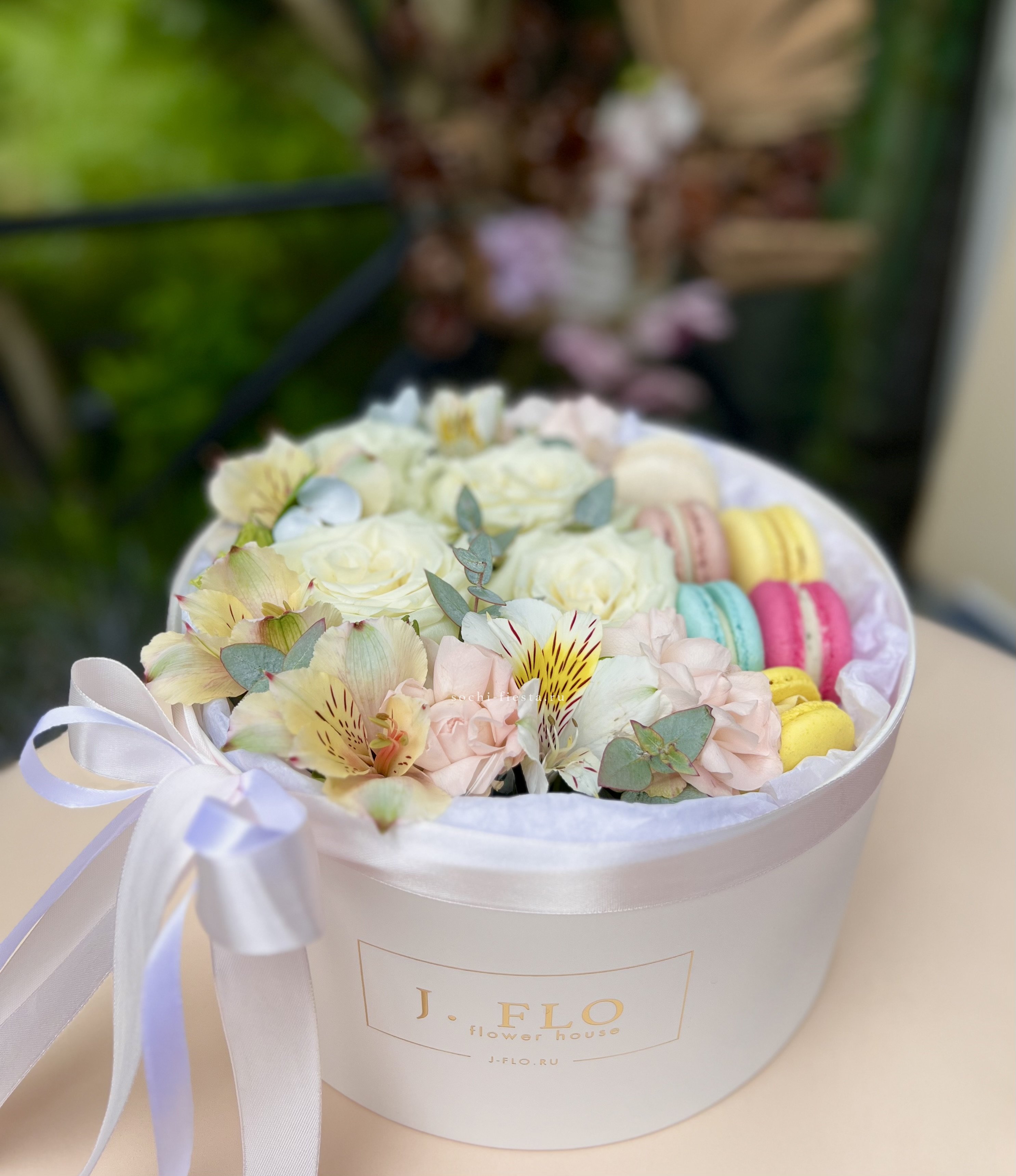 Композиция в квадратной коробке объединяет воздушный хлопок и яркие диантусы с пятью французскими макаронс. Компактная форма удобна для размещения на столе или полке. Готовое решение для приятного сюрприза.