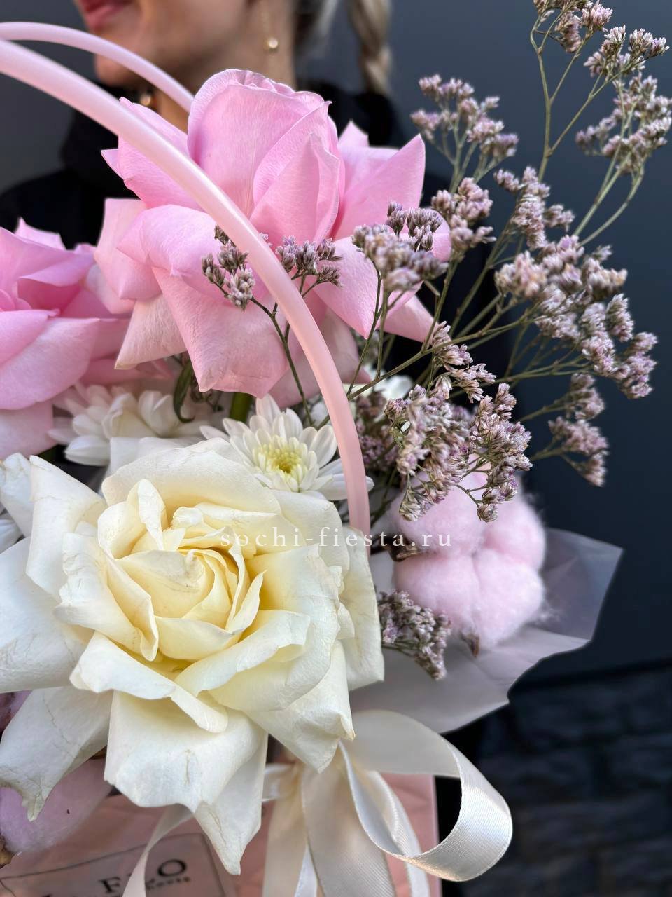 розовая роза, пионовидная роза, диантус, гортензия, эвкалипт, лента, сумка-кашпо.