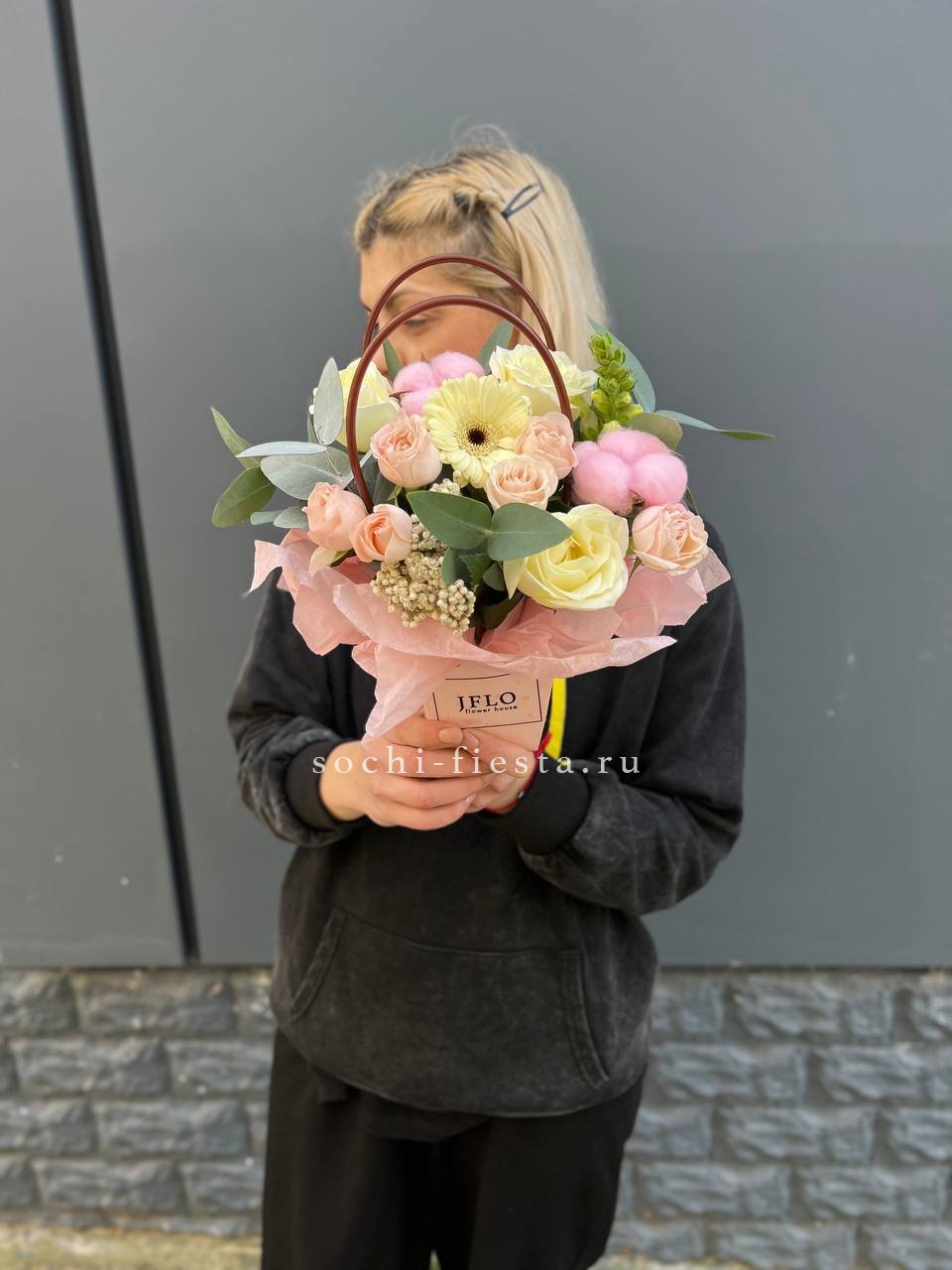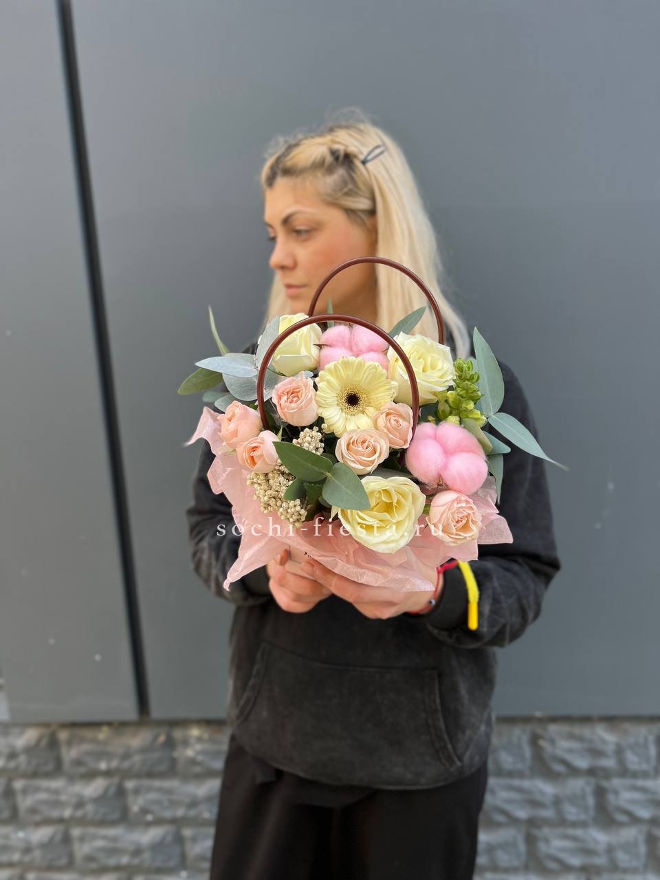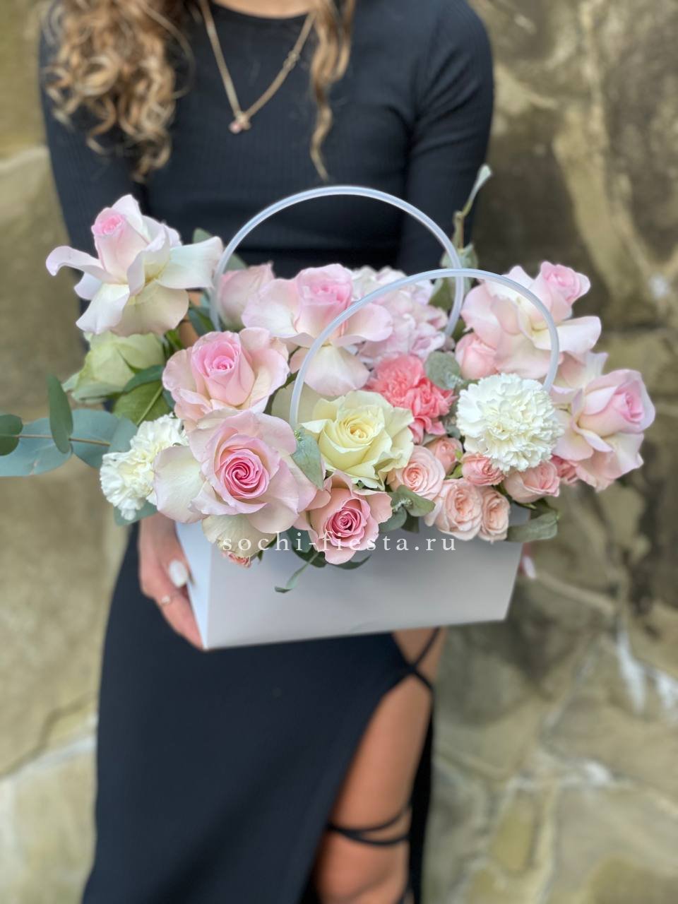 Пышные головки пионовидных роз задают объём, а мелкие соцветия диантуса разбивают плотность. Гортензия добавляет воздушную текстуру, эвкалипт смягчает линии. Композиция в сумке-кашпо выглядит свободно и живо.