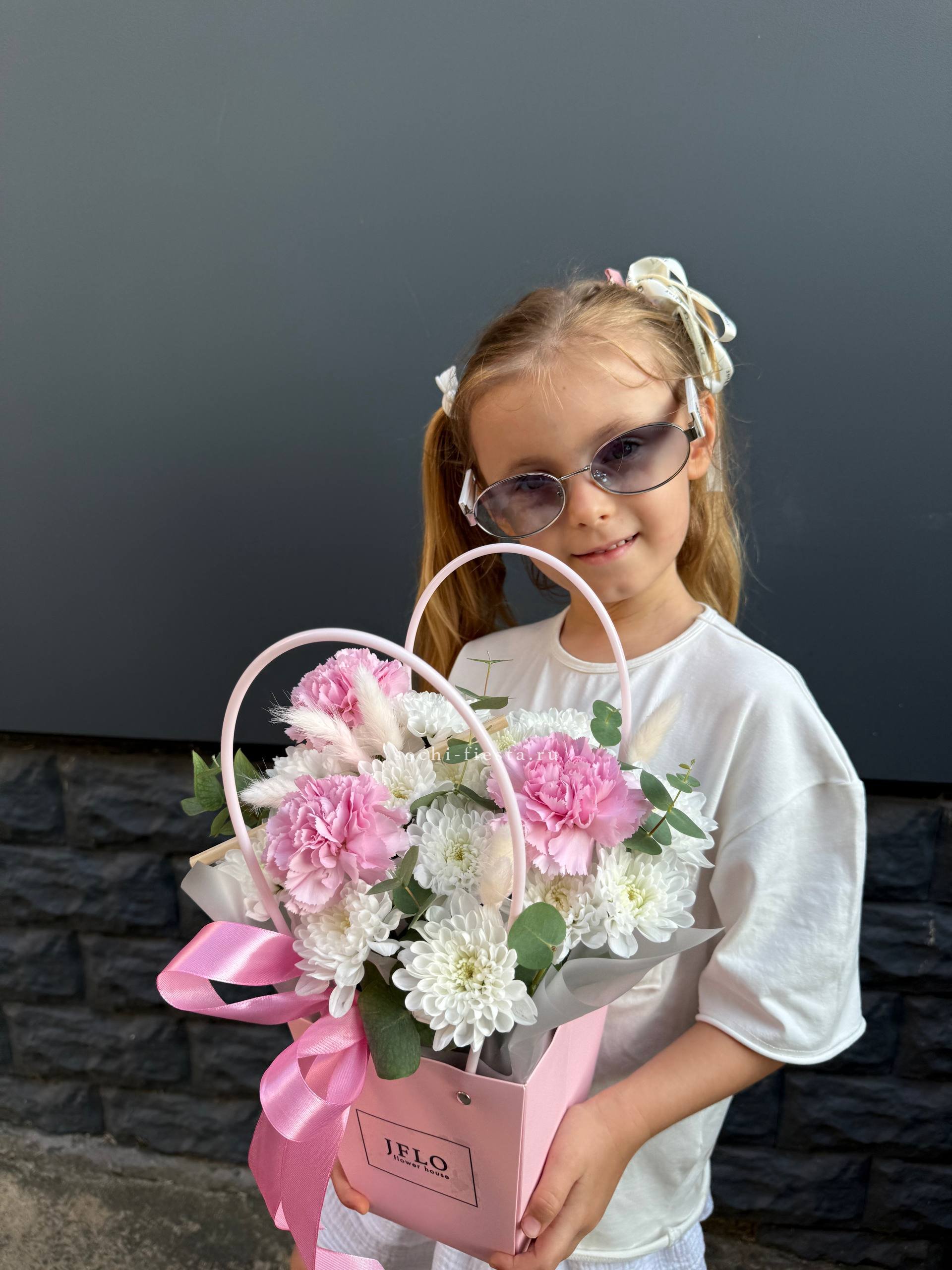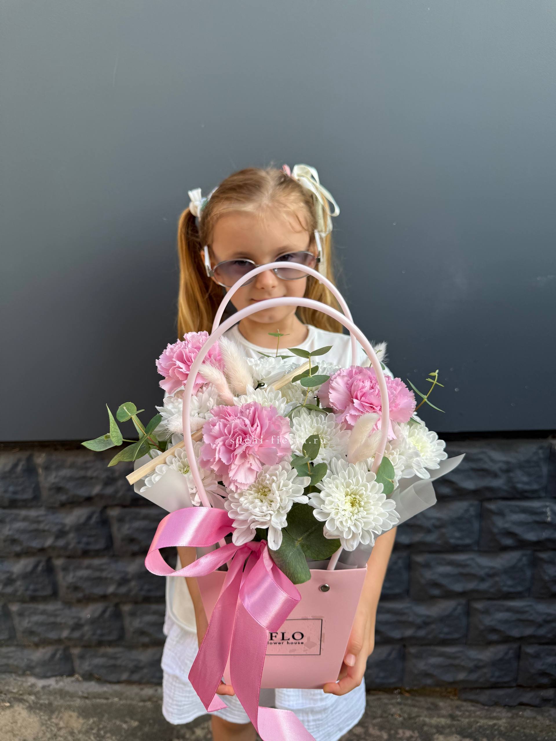 Герберы и маттиола вместе с диантусами выстраивают вертикальный ритм в flower bag. Белая роза и кустовая хризантема добавляют композиции завершенность.