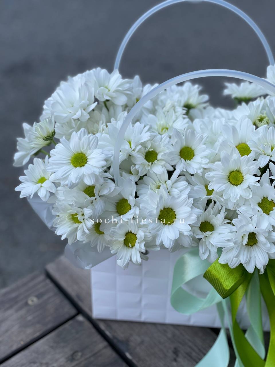 Белые хризантемы-ромашки собраны плотной шапкой и обрамлены легкими складками тишью. Простая графичная форма в удобной сумке подходит для любого интерьера.