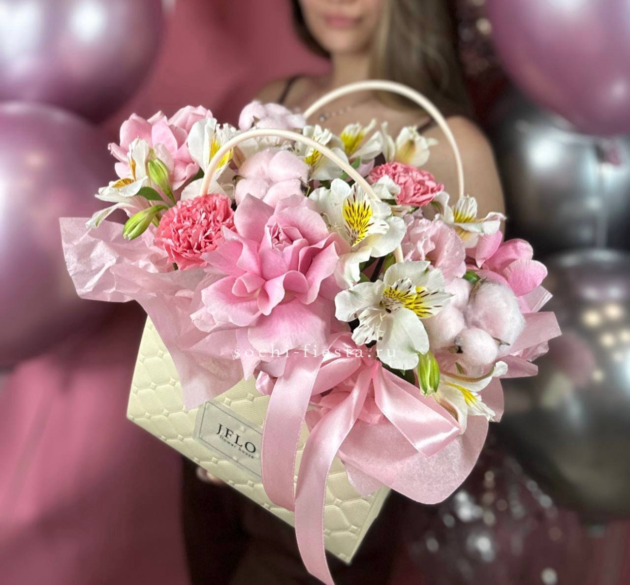сумочка в нежных тонах из диантусов, роз, гортензий, маттиолы, хризантемы.