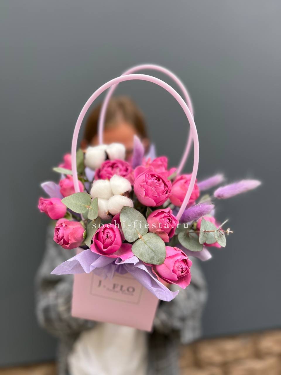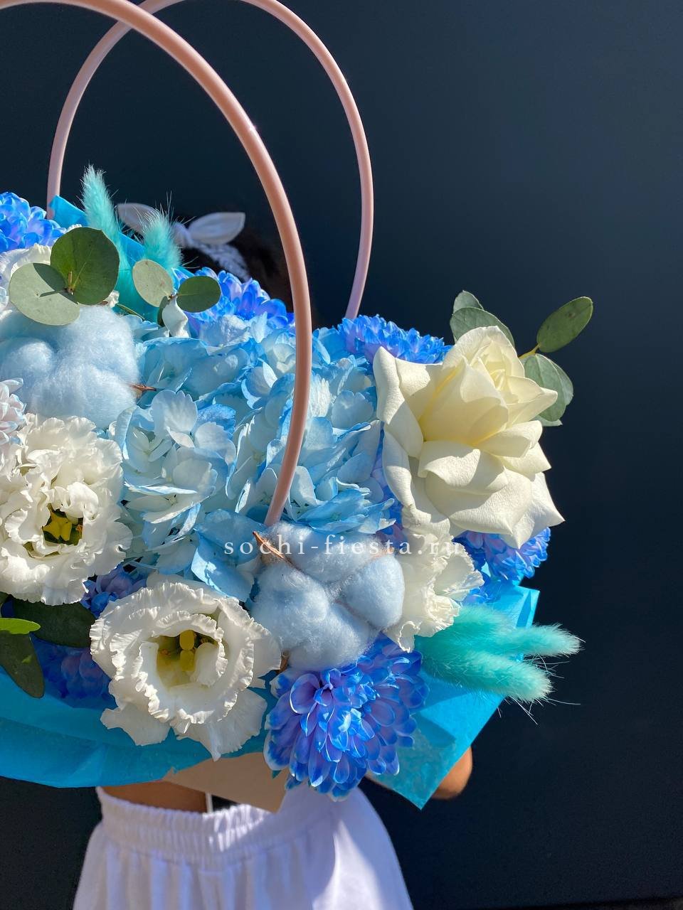 Голубая гортензия задаёт тон всей композиции, где хризантема и эустома создают объём, а хлопок с лагурусом добавляют воздушности. Сумочка вмещает насыщенную палитру без перегруженности.