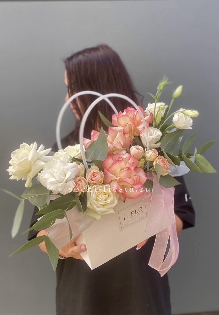 Хризантемы с пушистыми коробочками хлопка создают теплую домашнюю композицию в удобной сумочке. Цветы долго радуют взгляд и не требуют сложного ухода. Формат подходит для размещения в любом уголке дома.