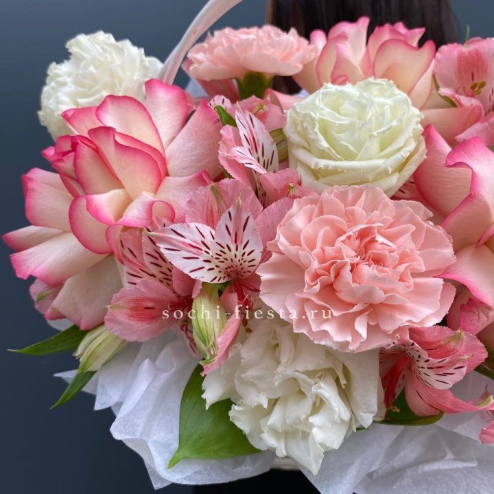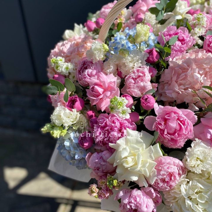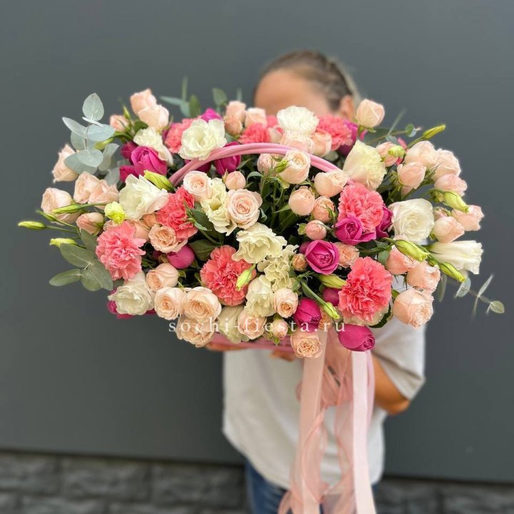 Состав корзин в Калуге определяется текущими поставками и сезоном. Розы Freedom, Mondial, Cappuccino — для классических куполообразных аранжировок. Пионы в мае-июне из свежих поставок: Sarah Bernhardt, Red Charm, Bowl of Cream — главный сезонный продукт. Хризантема, альстромерия, гербера — для объёмных торжественных наполнений. Эустома, ранункули — для садовых корзин. Флорист строит состав под конкретный запрос.