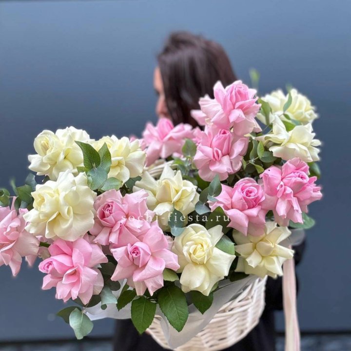 Именинная корзина в Калуге — самый популярный частный формат. Флорист создаёт куполообразную аранжировку в плетёной корзине диаметром 35-55 см. Розы или пионы в основе, зелень и декоративные акценты — нарядный объект, который сразу создаёт торжественную атмосферу. Именно такую корзину несут на юбилей или важный день рождения, когда хотят, чтобы подарок был виден и запомнился.