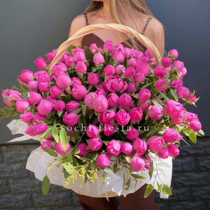 Каждый сезон приносит в Калуге свой ассортимент корзин. Весной флорист создаёт корзины с тюльпанами и нарциссами — лёгкие, нежные, полные ощущения обновления. В мае-июне приходят пионы — Sarah Bernhardt, Bowl of Cream, Red Charm — главный флористический праздник. Осенью — хризантема в тёплых гаммах с декоративными ягодами и ветвями. Зимой — хвойные аранжировки с амариллисом для праздничной атмосферы.