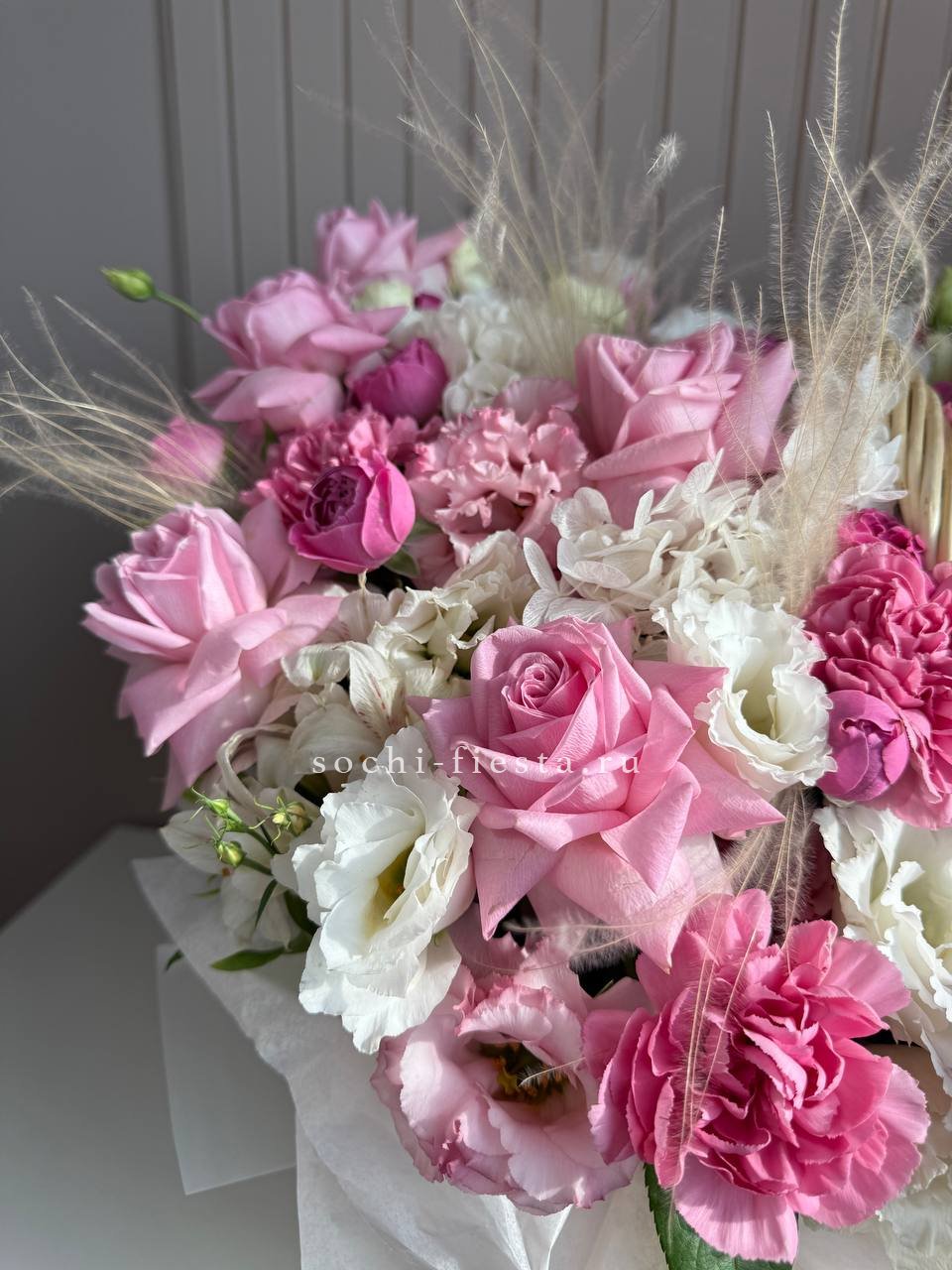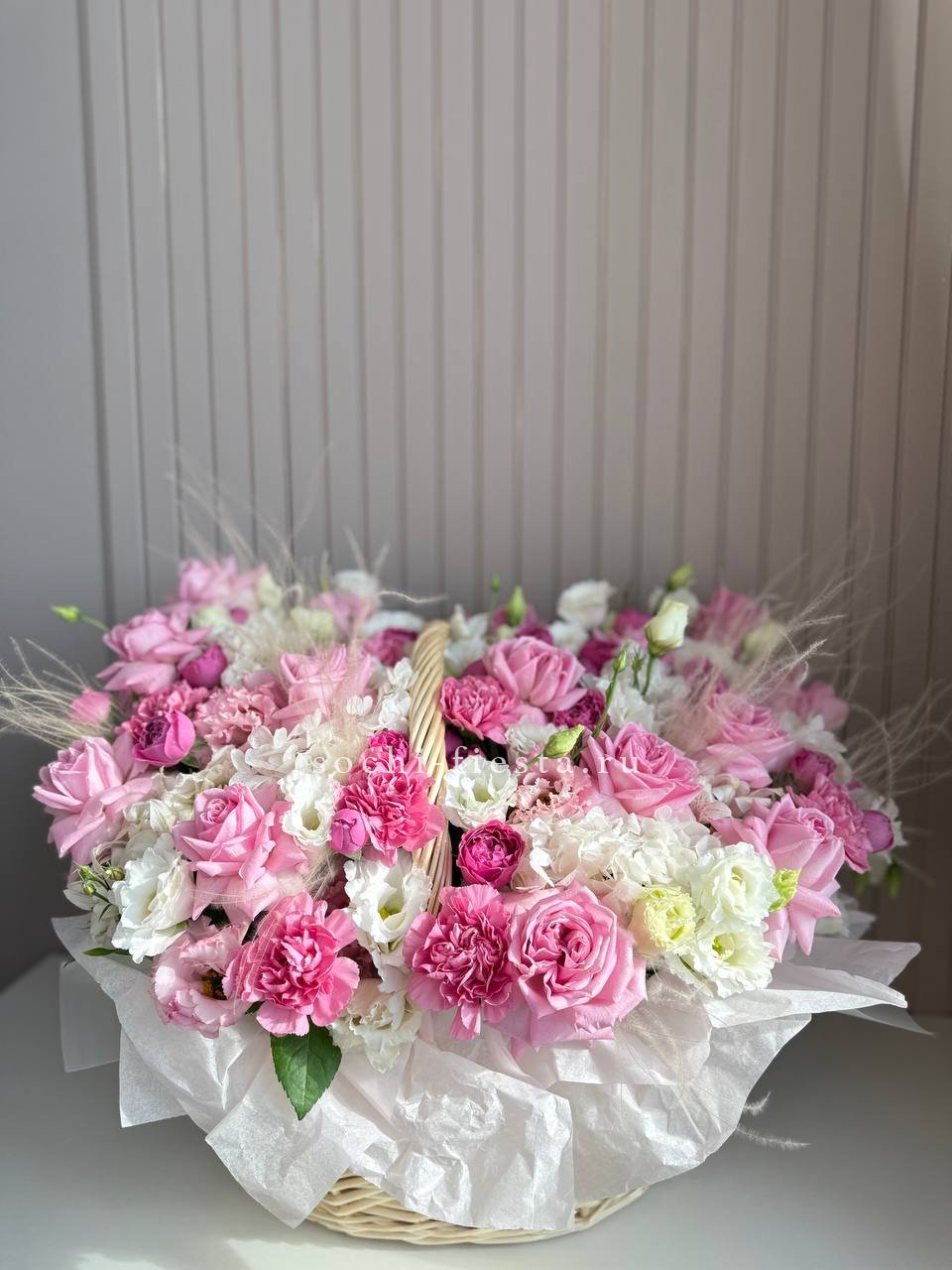 цветочная корзина с розами, мисти баблс, диантусами и гортензией.