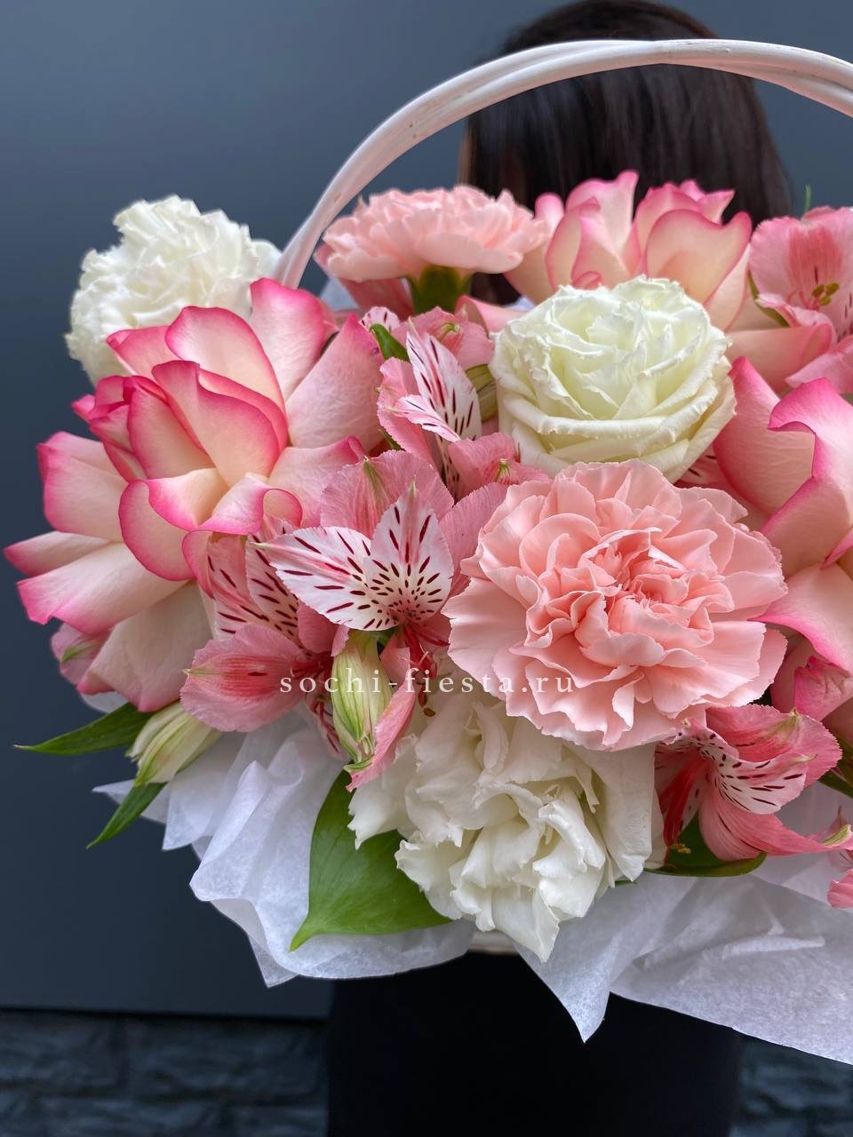 Пышная корзина с крупными бутонами роз, лилий и гортензий создаёт объёмную композицию с плавными переходами между соцветиями. Пионы добавляют воздушности и мягкости всей форме.