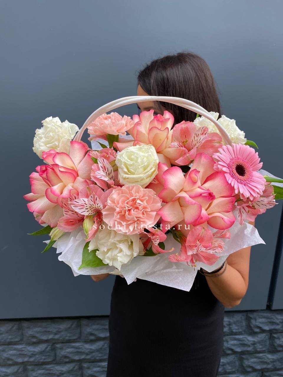 гортензия, розы одноголовые, лилии, пионы или замена на сезонные цветы, вспомогательная зелень, лента, корзина D40.
