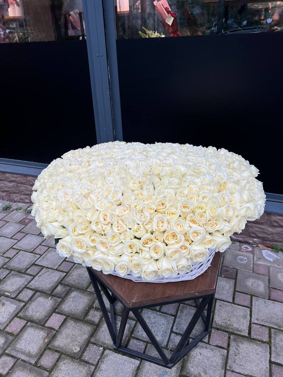 Пышная композиция в корзине собрана из роз двух видов и воздушной эустомы в бело-розовой гамме. Фисташка добавляет свежести, а округлая форма создает ощущение наполненности и объема.