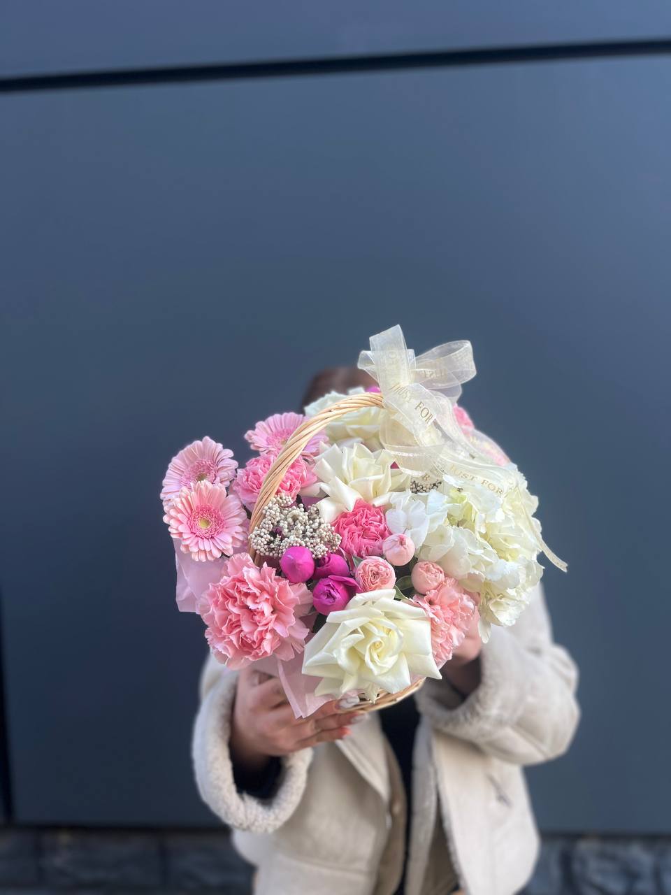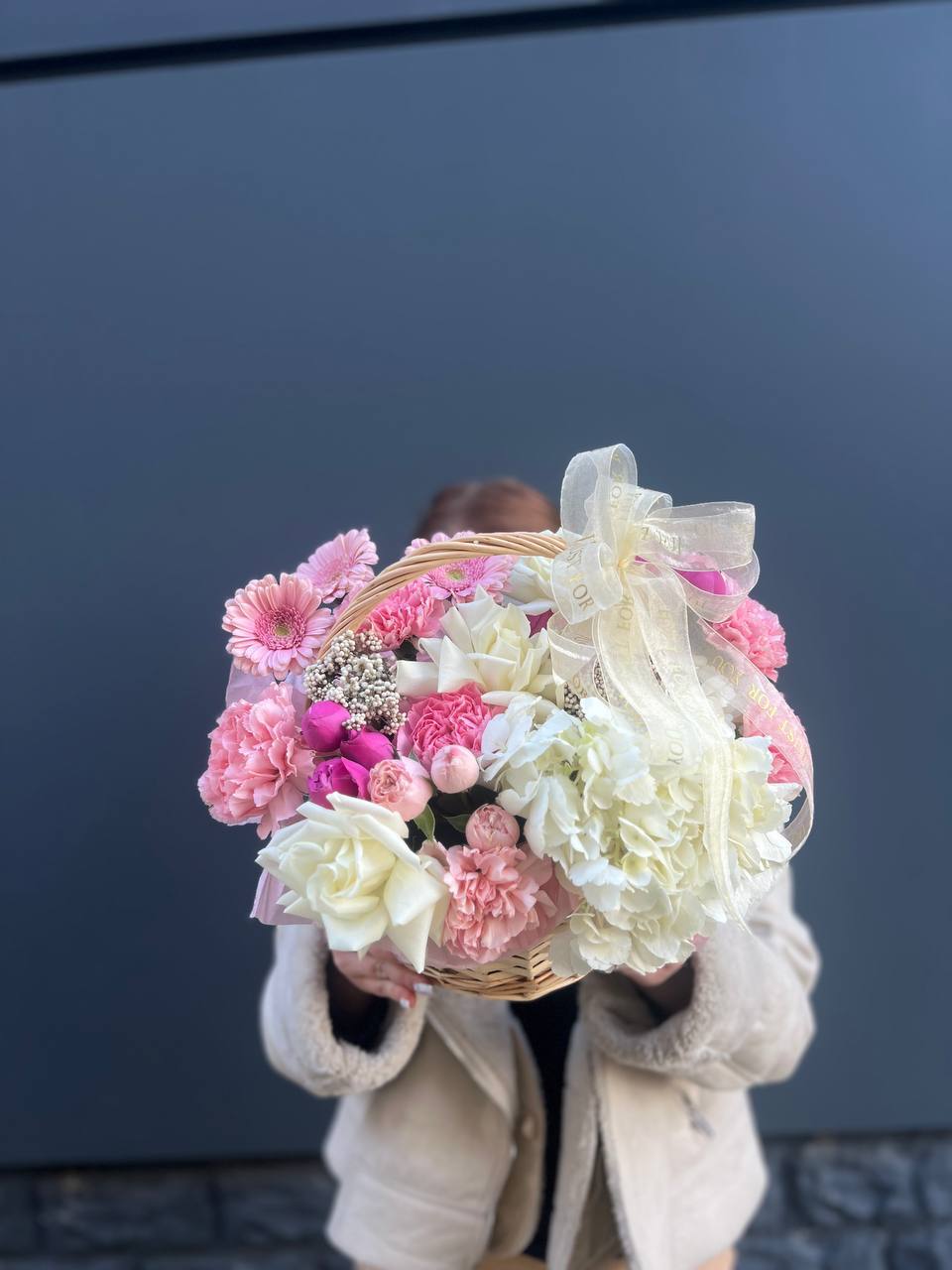 Солнечная мимоза встречается с тюльпанами и пионовидными розами Мисти Бабблс. Весенняя палитра собрана в корзине, где каждый цветок занимает свое место в общем ритме.