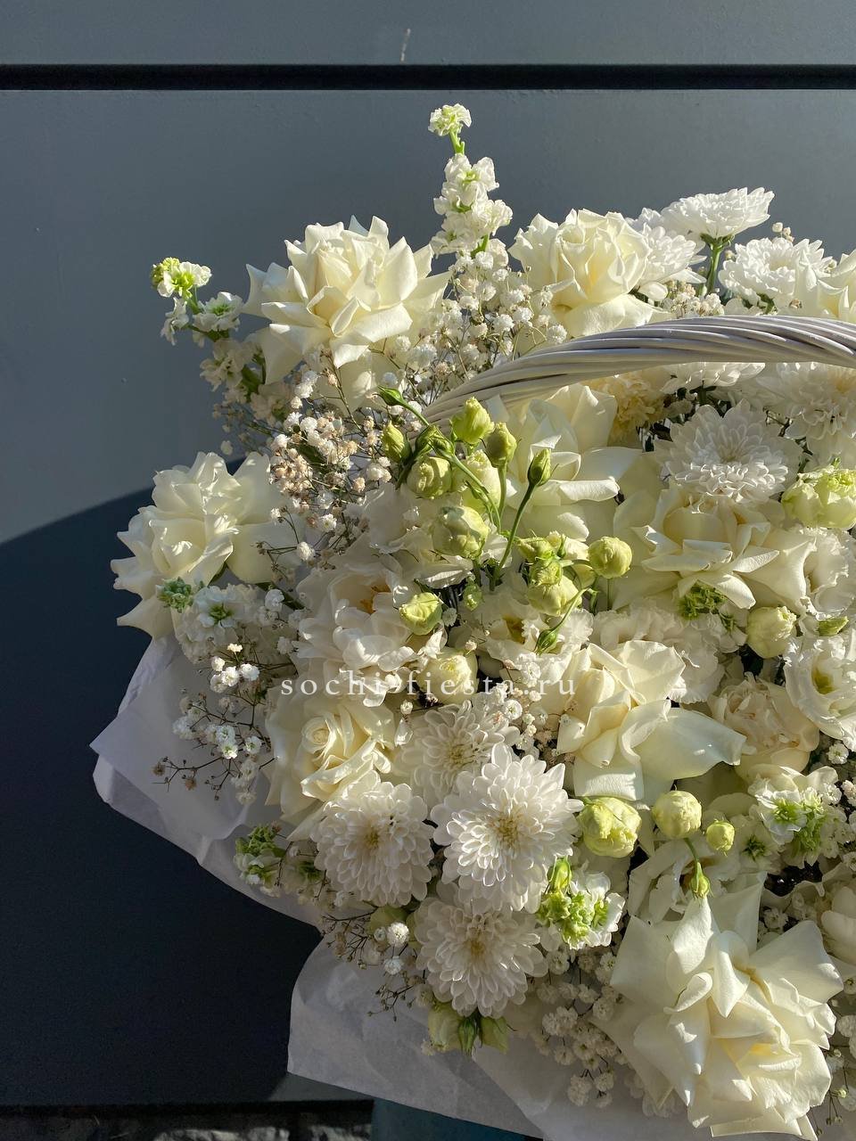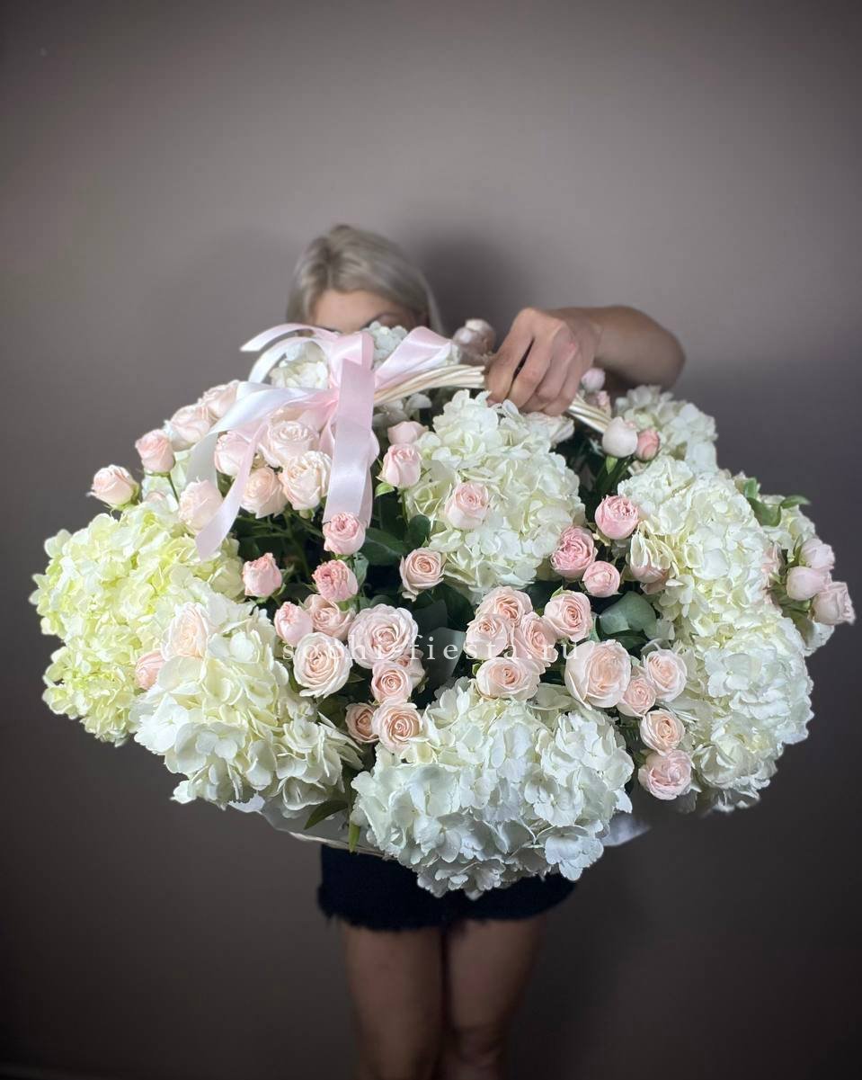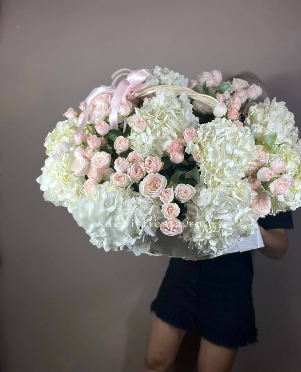 Пышная корзина объединяет пионовидные розы с воздушной гортензией и многослойной эустомой. Матиолла и лимониум добавляют глубину композиции, а диантус создает мягкие переходы между крупными бутонами.