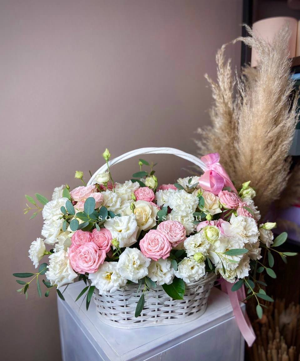 Воздушные соцветия эустомы собраны в округлую композицию с мягким переходом пастельных тонов. Светлая корзина создает легкую базу для объемной цветочной шапки.