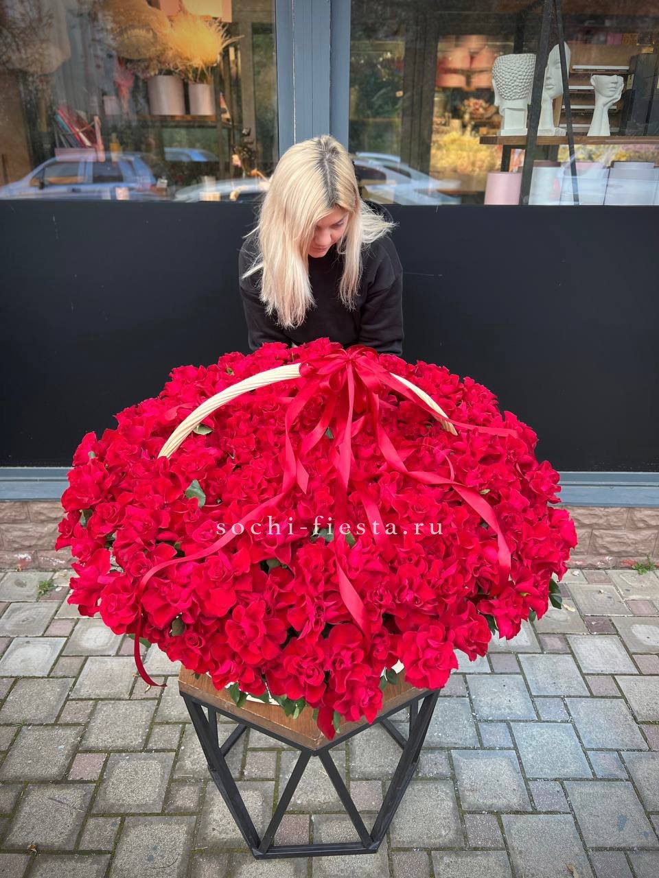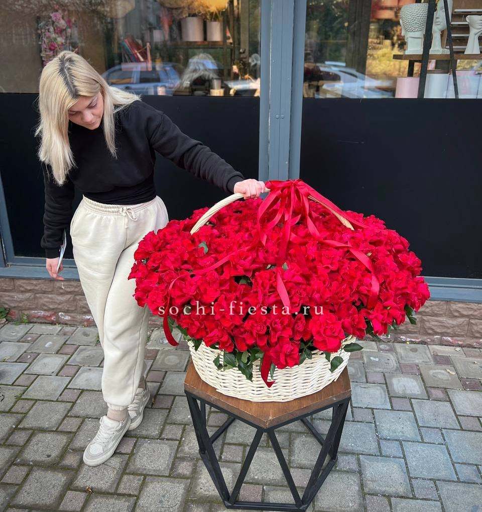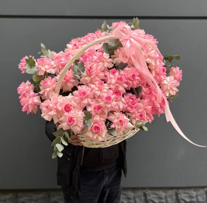 Сорок одна пионовидная роза в светлой корзине выстраивает объёмную композицию с мягкими переливами лилового и розового. Эвкалипт обрамляет густую россыпь бутонов.