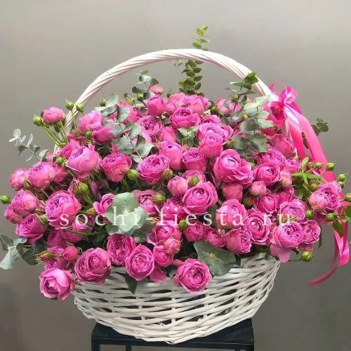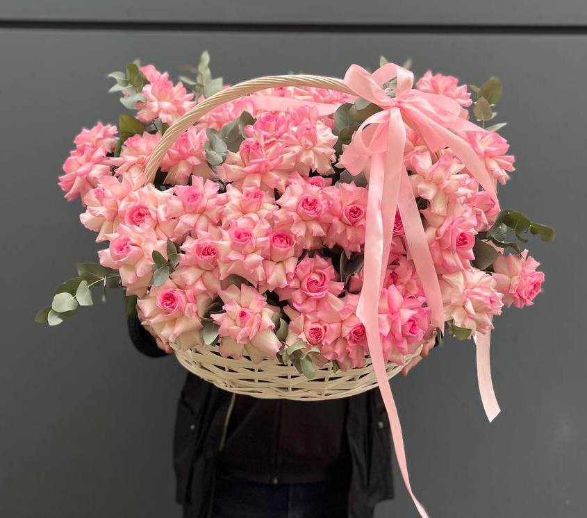 41 пионовидная кустовая роза Misty Bubbles, эвкалипт, светлая корзина.