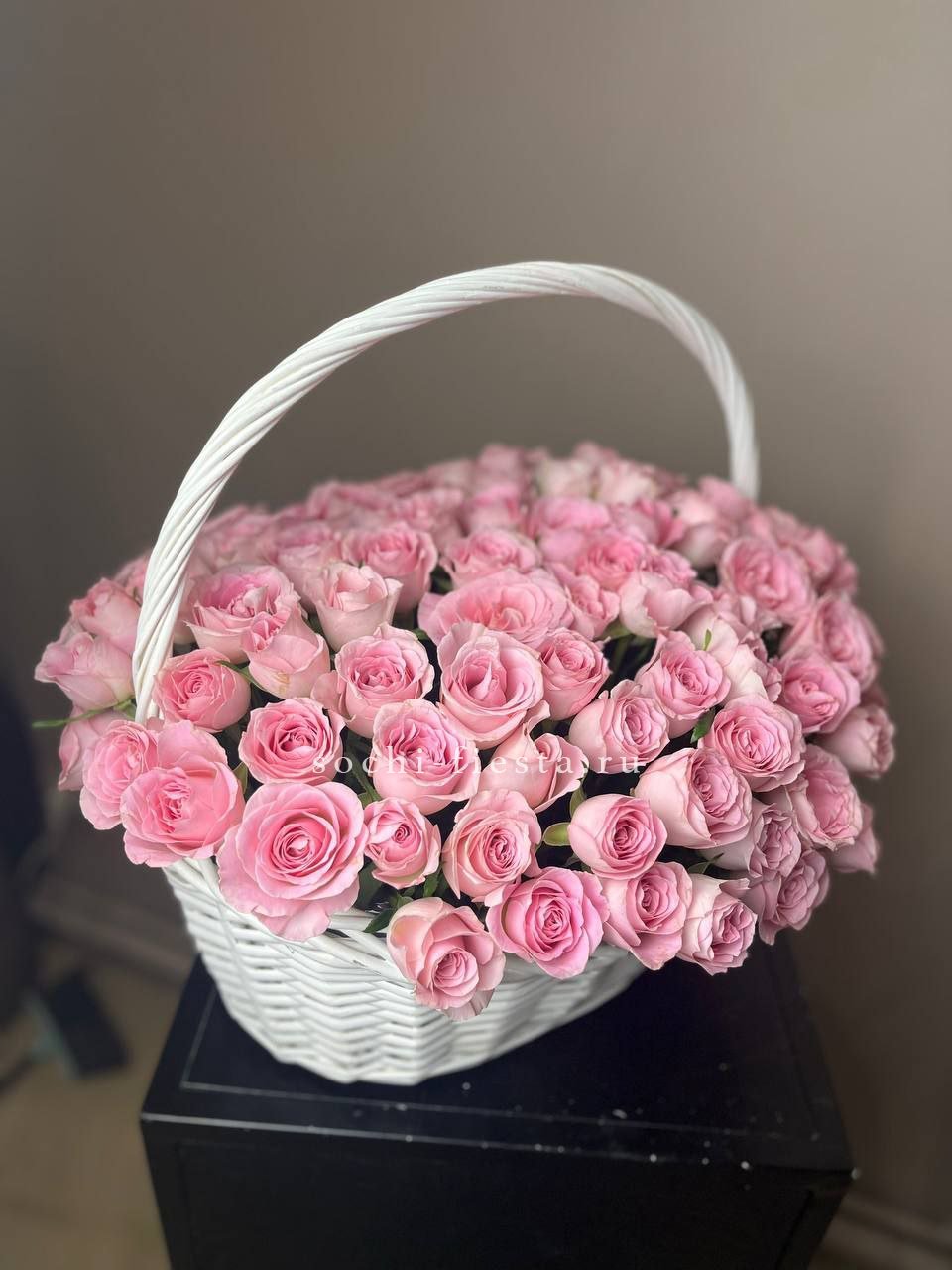 Двадцать пять французских роз с крупными бутонами и бархатистыми лепестками уложены в плетёную корзину. Натуральная основа придаёт композиции домашнее тепло и завершённость формы.