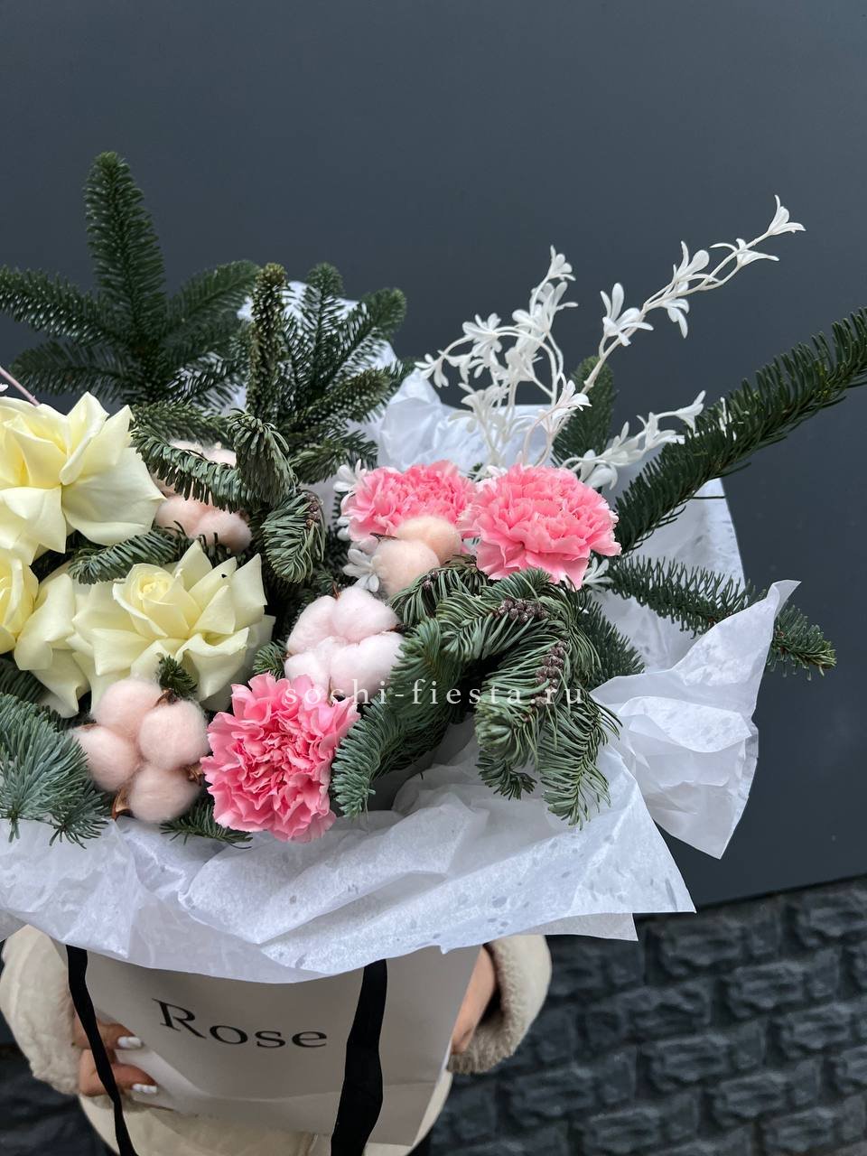 Белые розы и хлопок создают светлую основу, а нобилис вносит графичность. Диантус заполняет пространство мягкими переходами. Композиция выглядит объемно и сбалансировано.