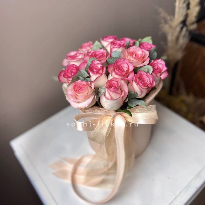 Шляпные коробки с розами — удобный подарочный формат. Флористическая губка внутри держит влагу, композиция стоит на столе 5-7 дней без пересадки в вазу. Популярный выбор на дни рождения коллег, выписку из роддома, юбилей родителей.