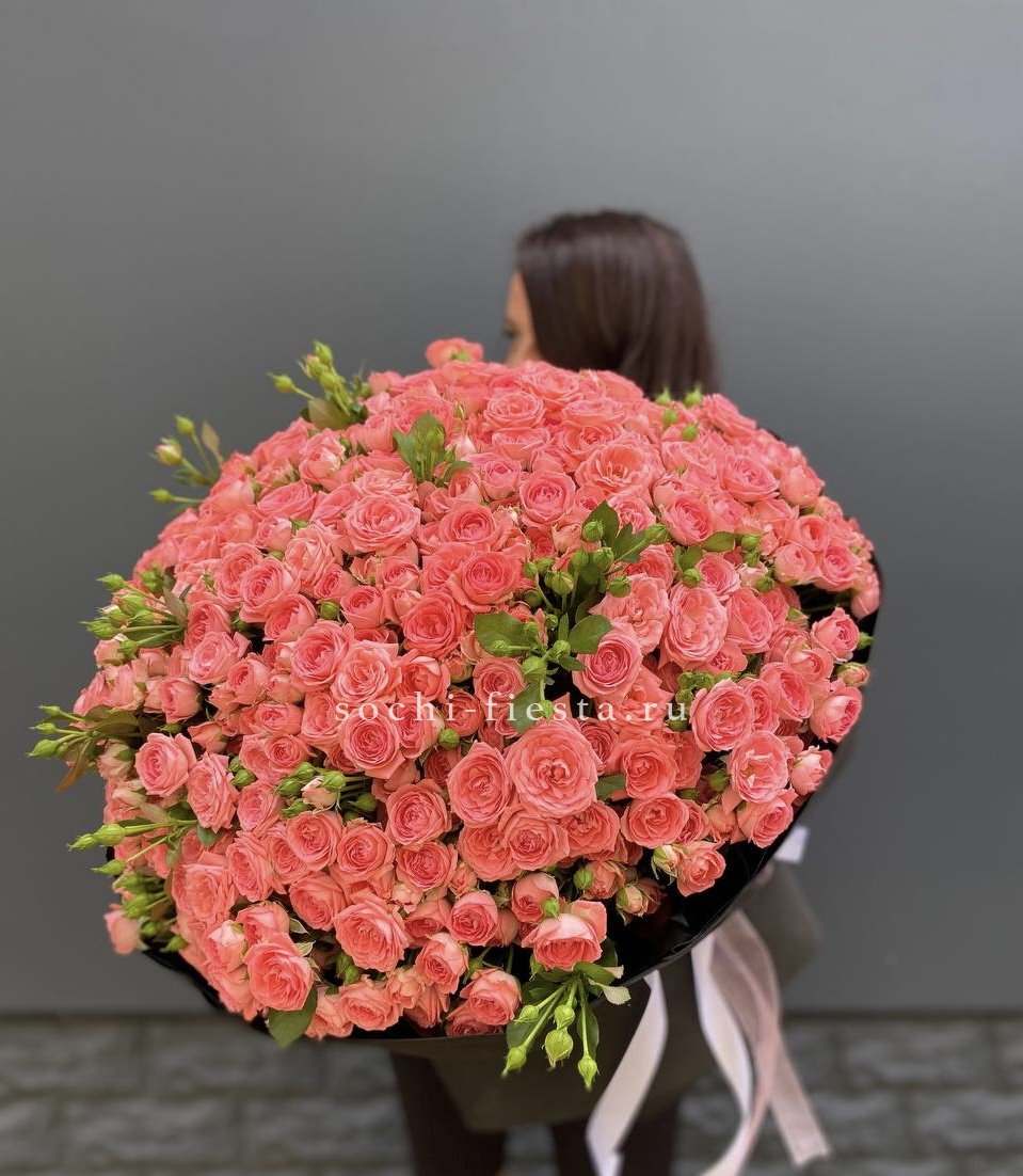 Сто один бутон в бело-розовой палитре создают объёмное облако цвета. Композиция впечатляет масштабом и наполняет пространство мягким сиянием лепестков.