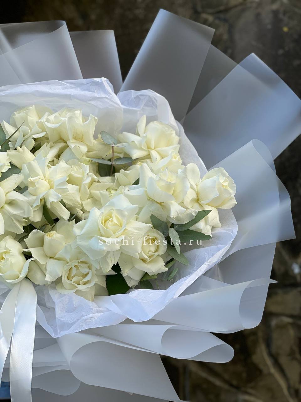 вывернутые розы - 21 шт., эвкалипт, лента, упаковка.