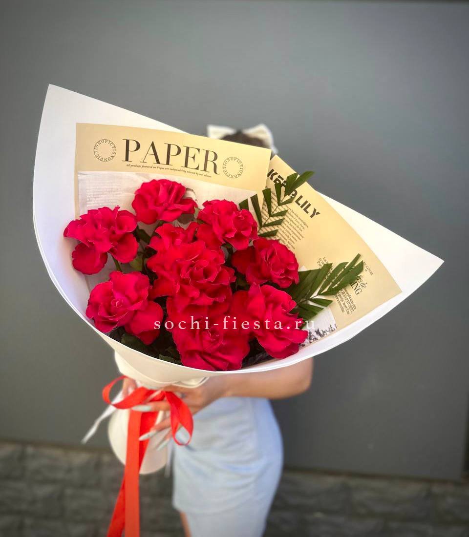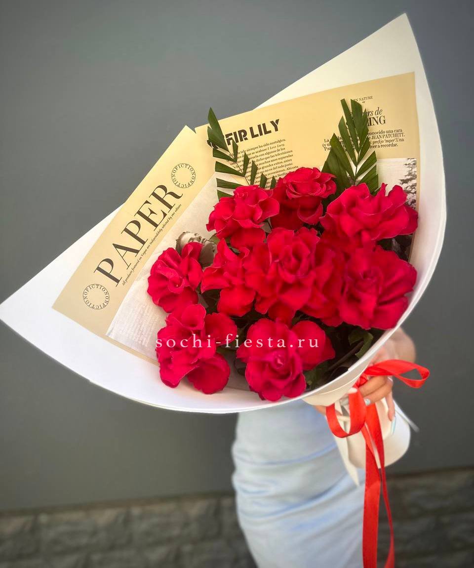 красные розы, лента, крафт.